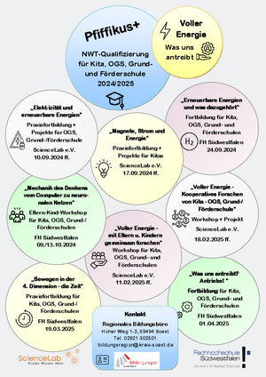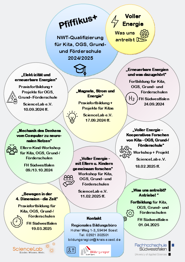Kinder aller Altersstufen sind fasziniert von der Natur, ihren Erscheinungen und Gesetzmäßigkeiten. Ein gemeinsames Projekt der Bildungsregion Kreis Soest, Fachhochschule Südwestfalen und der Bildungseinrichtung ScienceLab e.V. will diese Neugier wissenschaftlich begleiten und fördern: "Pfiffikus+" bietet gemeinsame Qualifizierungsangebote für Pädagoginnen und Pädagogen sowie Erzieherinnen und Erzieher aus Kitas, OGS, Grund- und Förderschulen in der Bildungsregion Kreis Soest.