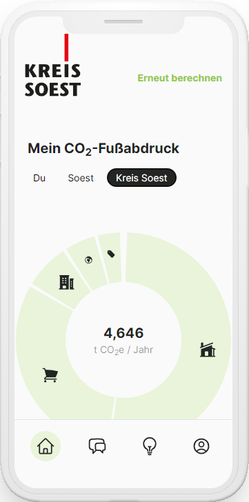 Der Kreis Soest stellt eine App zum Ermitteln des eigenen CO2-Fußabdrucks zur Verfügung, die sowohl als Website als auch im Apple Store sowie im Android Play Store verfügbar ist. Ferner bietet sie Ideen, um seinen persönlichen CO2-Fußabdruck weiter zu reduzieren und dazu auch die Möglichkeit, sich mit Gleichgesinnten auszutauschen.