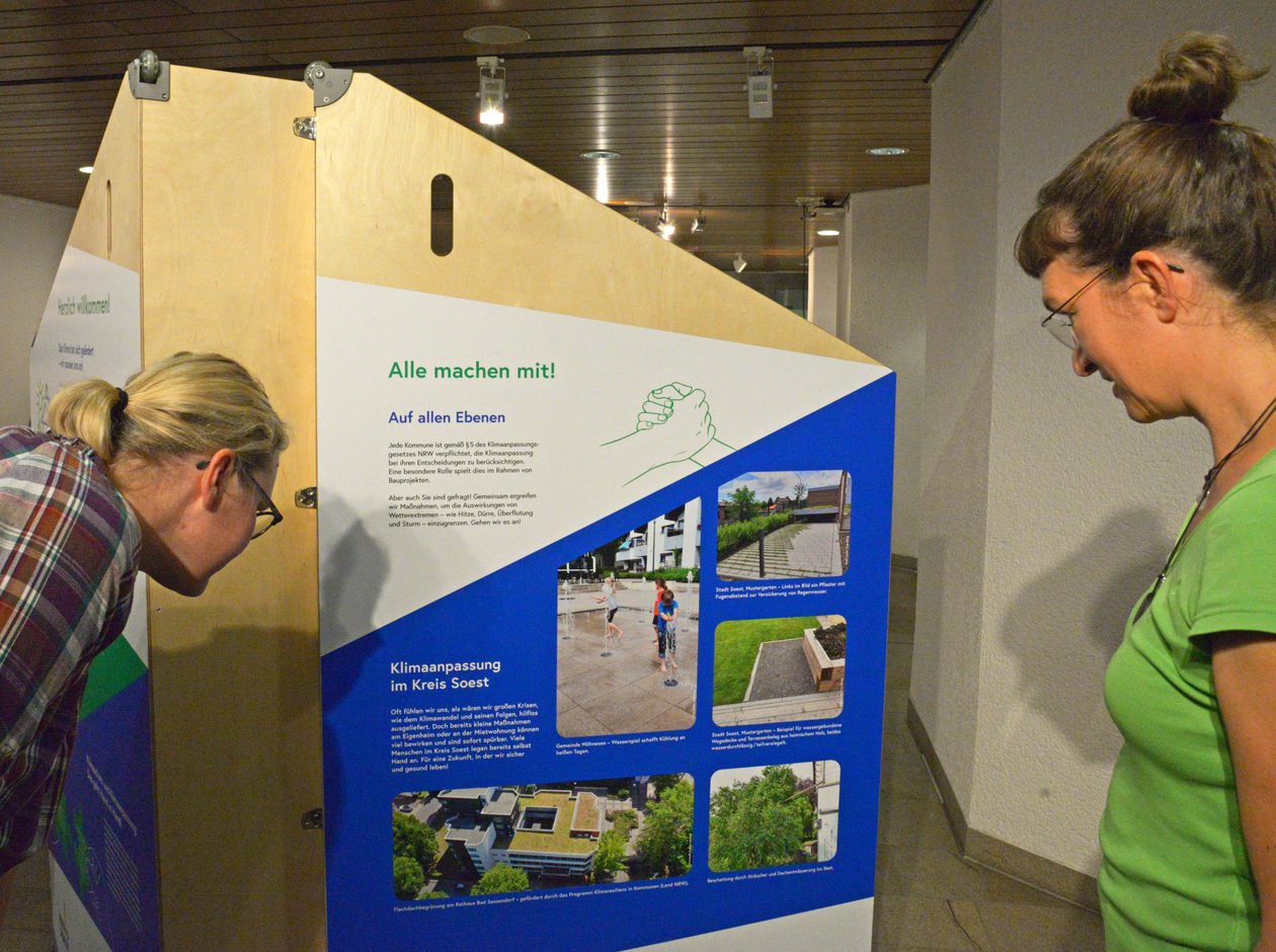Die Ausstellung „Aufgepasst. Angepasst!“ gibt einen Überblick über die Folgen des Klimawandels, welche Herausforderungen noch zu erwarten sind und wie ihnen begegnet werden kann. Sie ist als Wanderausstellung konzipiert und wird in den Städten und Gemeinden des Kreises Soest zu sehen sein, um möglichst viele Menschen für das Thema zu sensibilisieren.