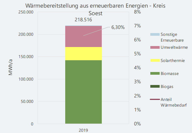 Das nächste Diagramm zeigt die im Kreis Soest erzeugte Menge an erneuerbaren Energien, die eingespeist wurde. Hier gab es einen leichten Anstieg von ca. 1.000 MWh/a, was dem durchschnittlichen Jahresverbrauch von etwa 333 2-Personenhaushalten entspricht. Die Abbildung zeigt allerdings nicht den Anteil der Eigennutzung. Die eingespeiste Menge an Energie entspricht bilanziell betrachtet 38% des Stroms, der im Jahr benötigt wird. Betrachtet man Strom und Wärme (für Wärme siehe nächste Abbildung), kommt man nur auf 8 % des Bedarfs.