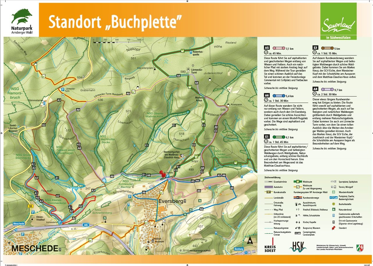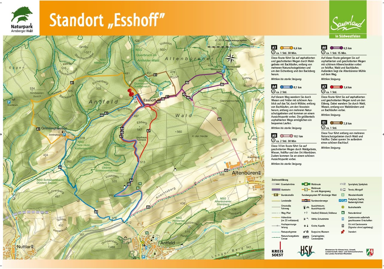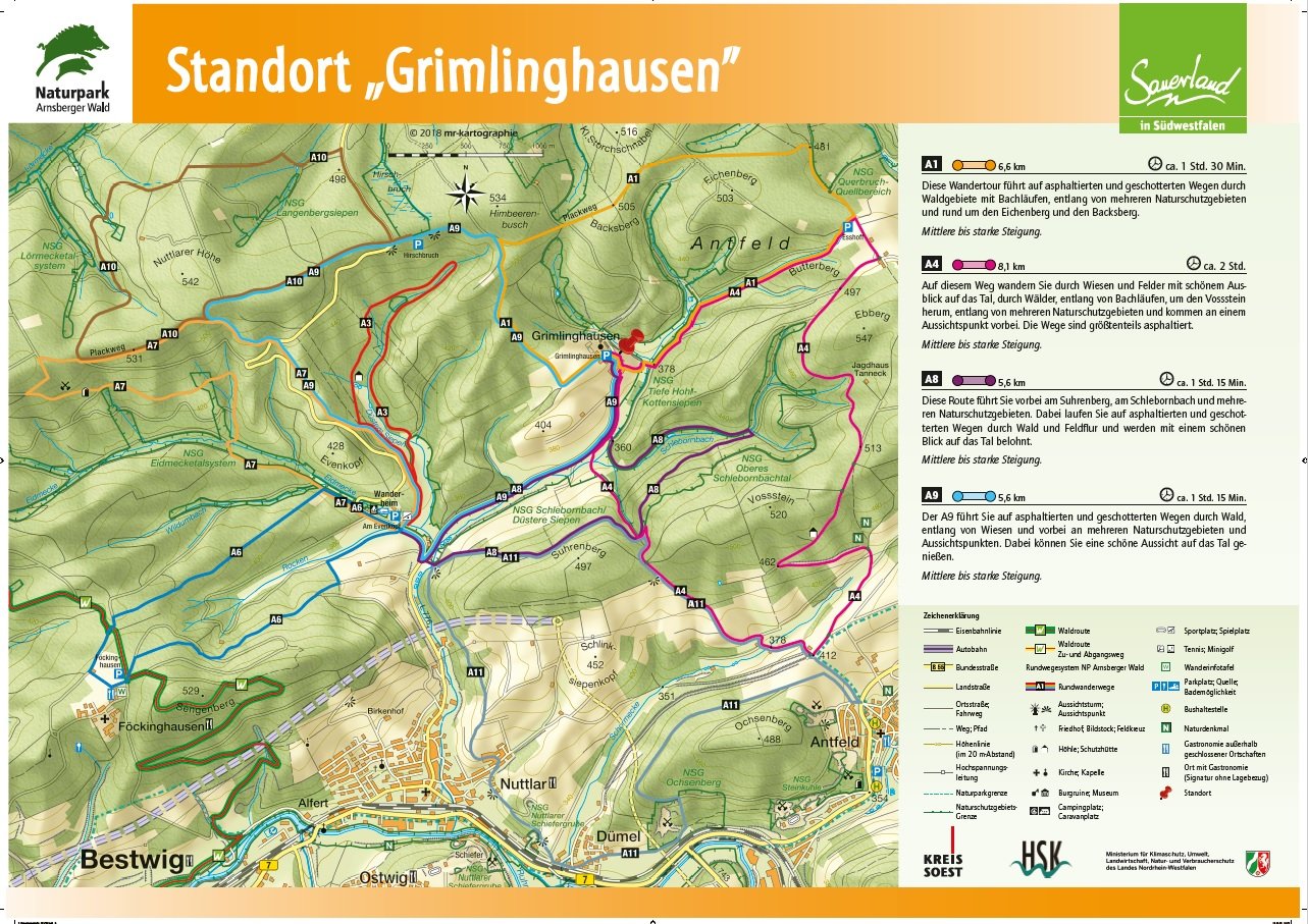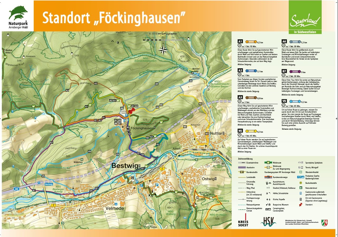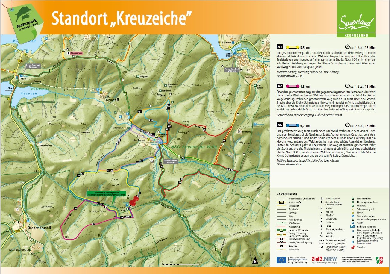 Auf den Orientierungstafeln sind zusätzlich Informationen zur Wegebeschaffenheit sowie zu den Besonderheiten und Sehenswürdigkeiten im Landschaftsraum zu finden. Dadurch entgeht Ihnen nichts am Wegesrand. Beeindruckende Landschaftsphänomene, faszinierende Bauwerke und herrliche Aussichten sollen Sie begleiten bei Ihren Streifzügen durch den Naturpark Arnsberger Wald!