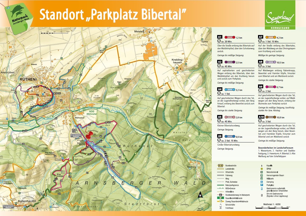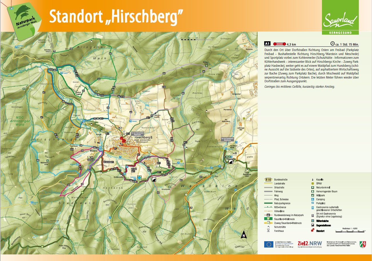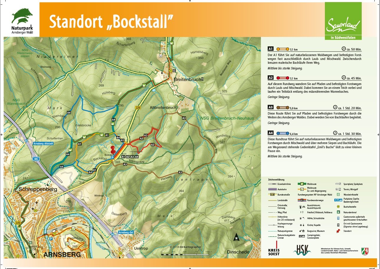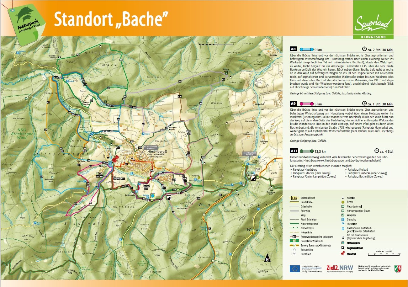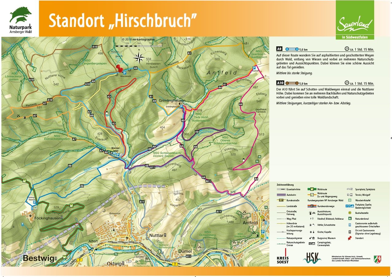 Auf den Orientierungstafeln sind zusätzlich Informationen zur Wegebeschaffenheit sowie zu den Besonderheiten und Sehenswürdigkeiten im Landschaftsraum zu finden. Dadurch entgeht Ihnen nichts am Wegesrand. Beeindruckende Landschaftsphänomene, faszinierende Bauwerke und herrliche Aussichten sollen Sie begleiten bei Ihren Streifzügen durch den Naturpark Arnsberger Wald!