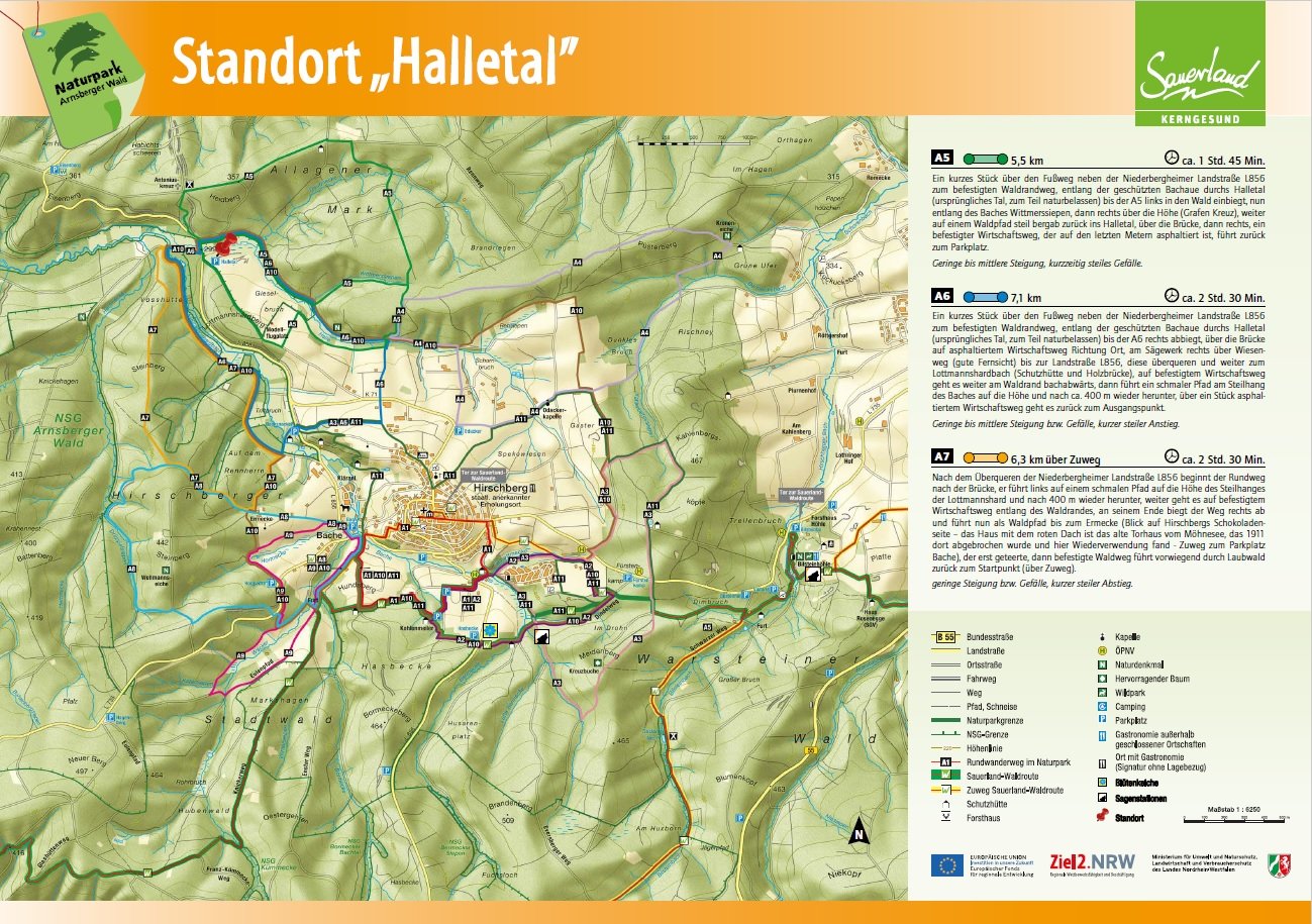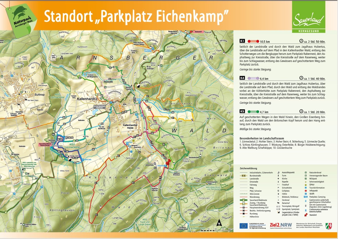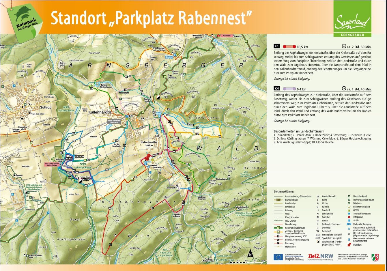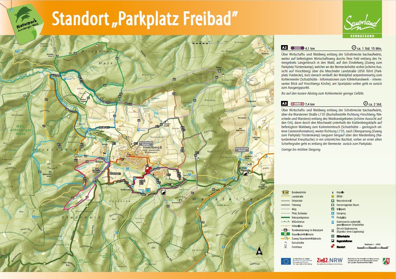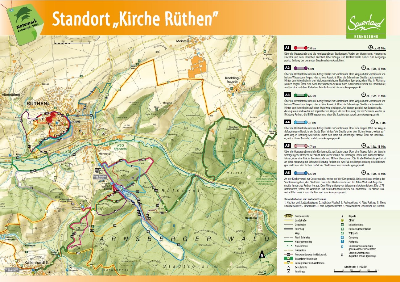 Auf den Orientierungstafeln sind zusätzlich Informationen zur Wegebeschaffenheit sowie zu den Besonderheiten und Sehenswürdigkeiten im Landschaftsraum zu finden. Dadurch entgeht Ihnen nichts am Wegesrand. Beeindruckende Landschaftsphänomene, faszinierende Bauwerke und herrliche Aussichten sollen Sie begleiten bei Ihren Streifzügen durch den Naturpark Arnsberger Wald!