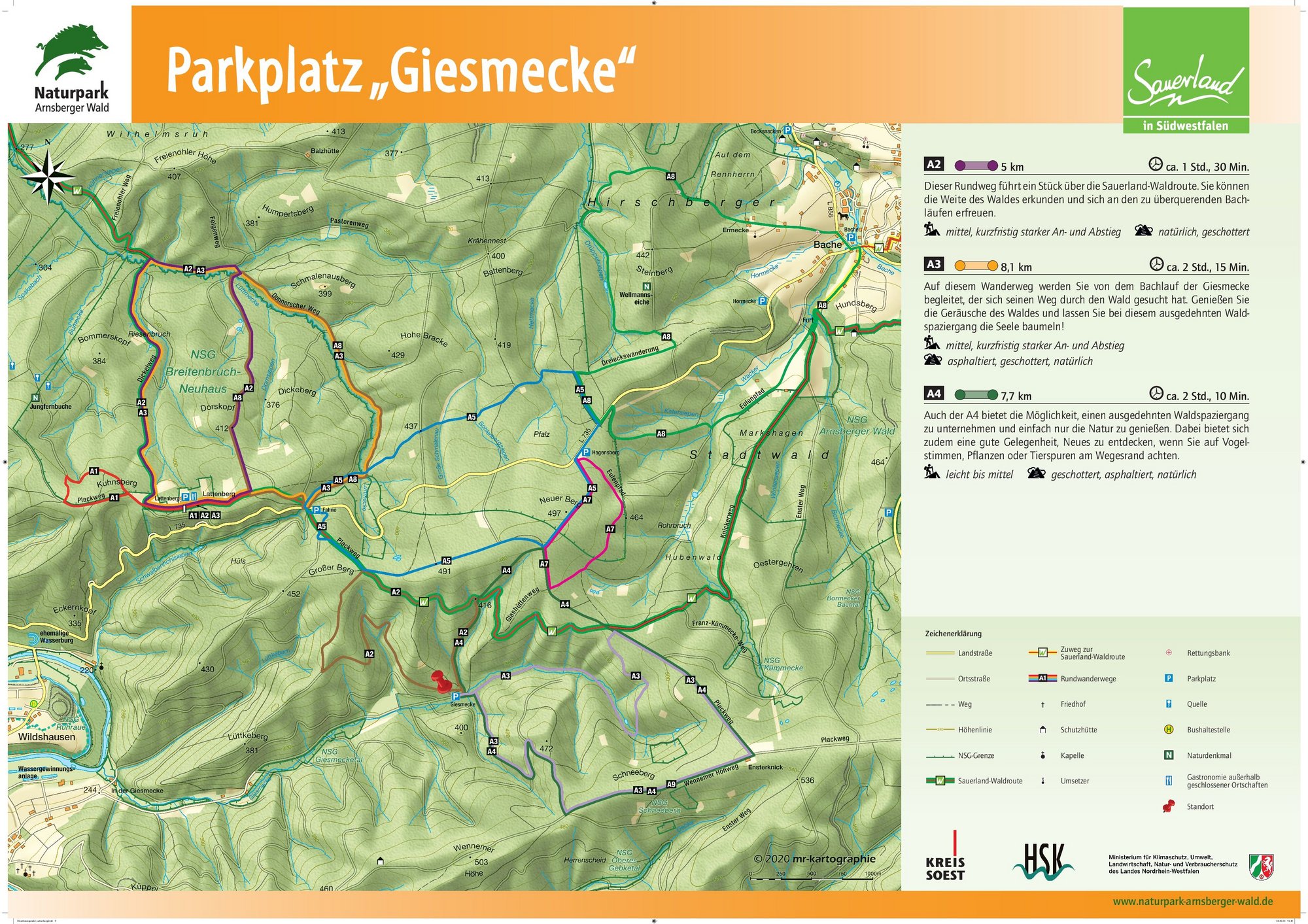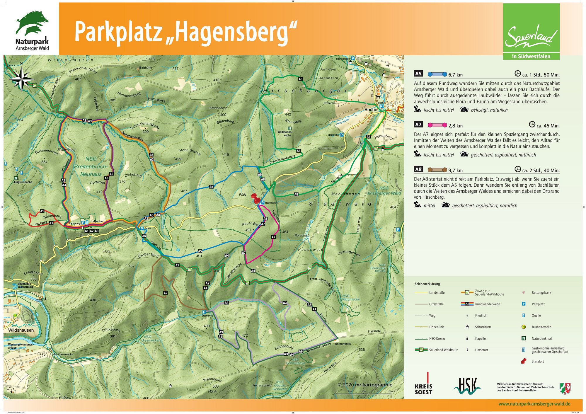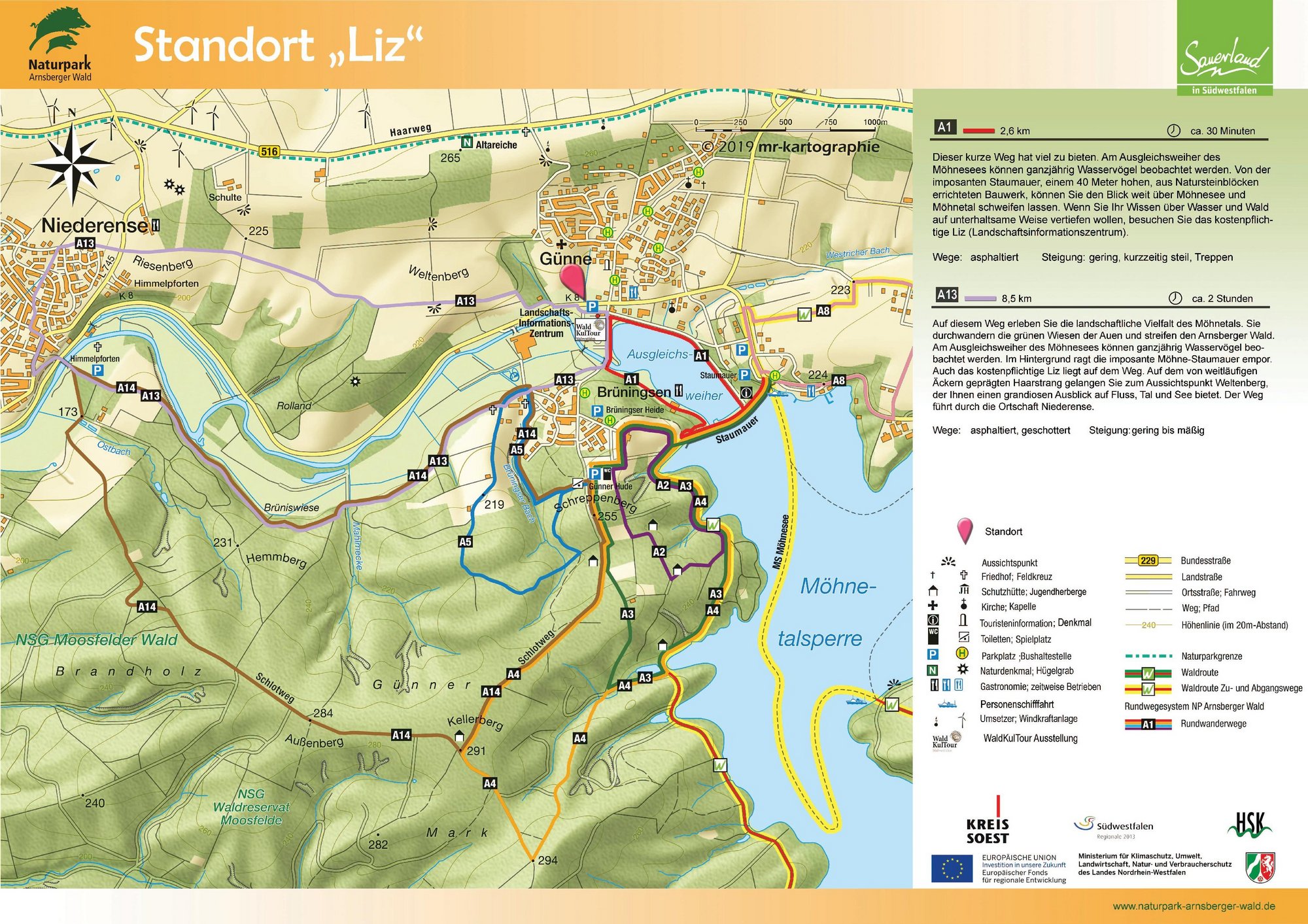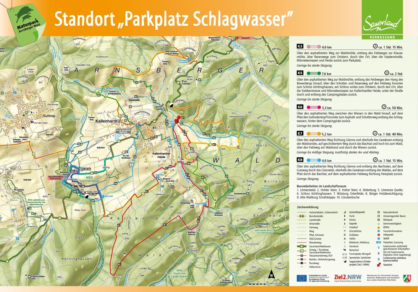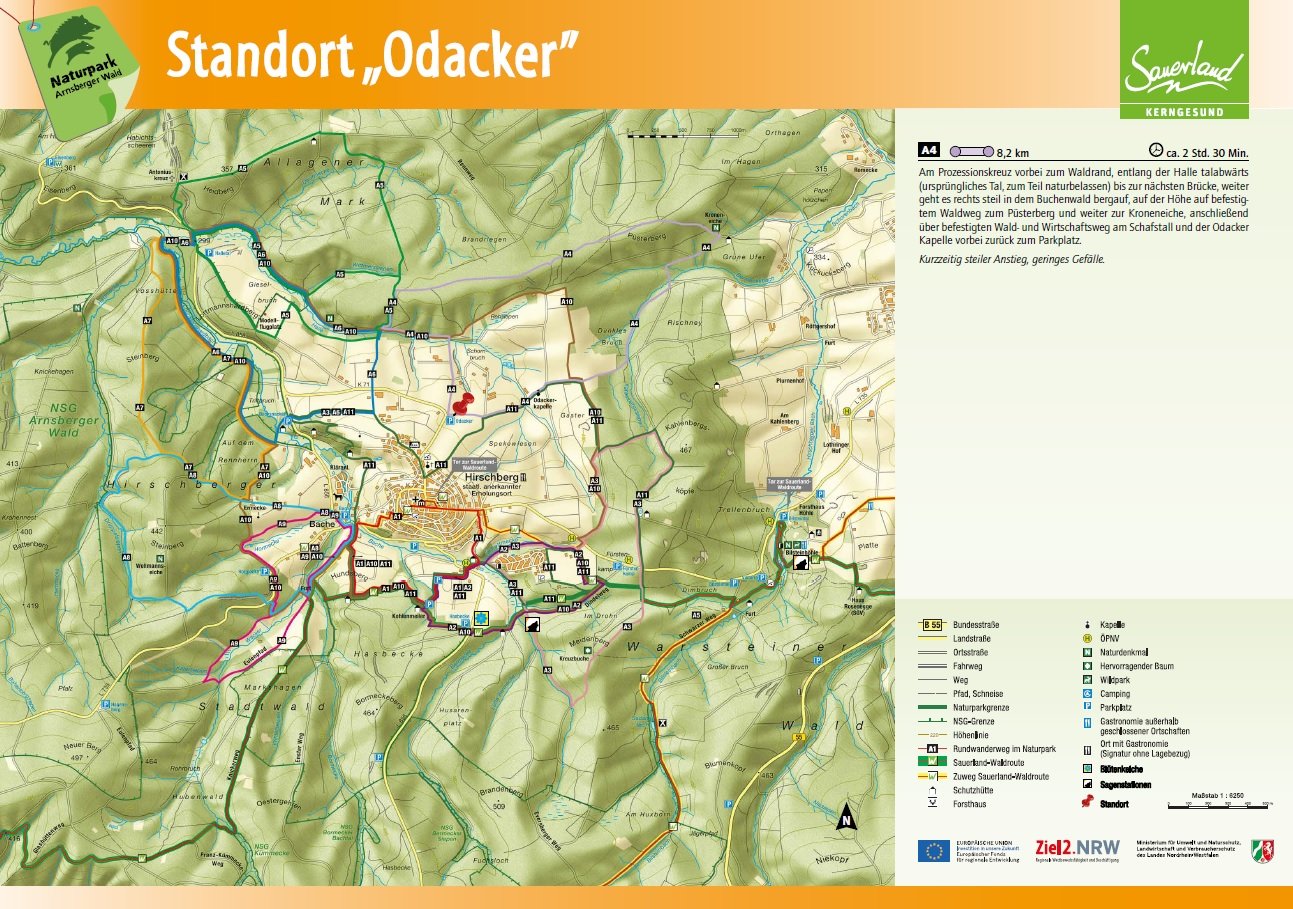 Auf den Orientierungstafeln sind zusätzlich Informationen zur Wegebeschaffenheit sowie zu den Besonderheiten und Sehenswürdigkeiten im Landschaftsraum zu finden. Dadurch entgeht Ihnen nichts am Wegesrand. Beeindruckende Landschaftsphänomene, faszinierende Bauwerke und herrliche Aussichten sollen Sie begleiten bei Ihren Streifzügen durch den Naturpark Arnsberger Wald!