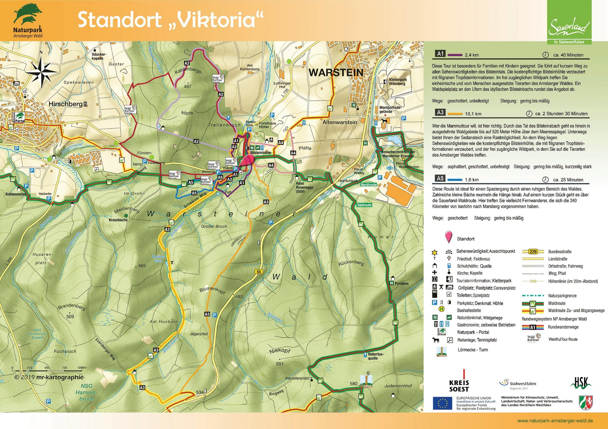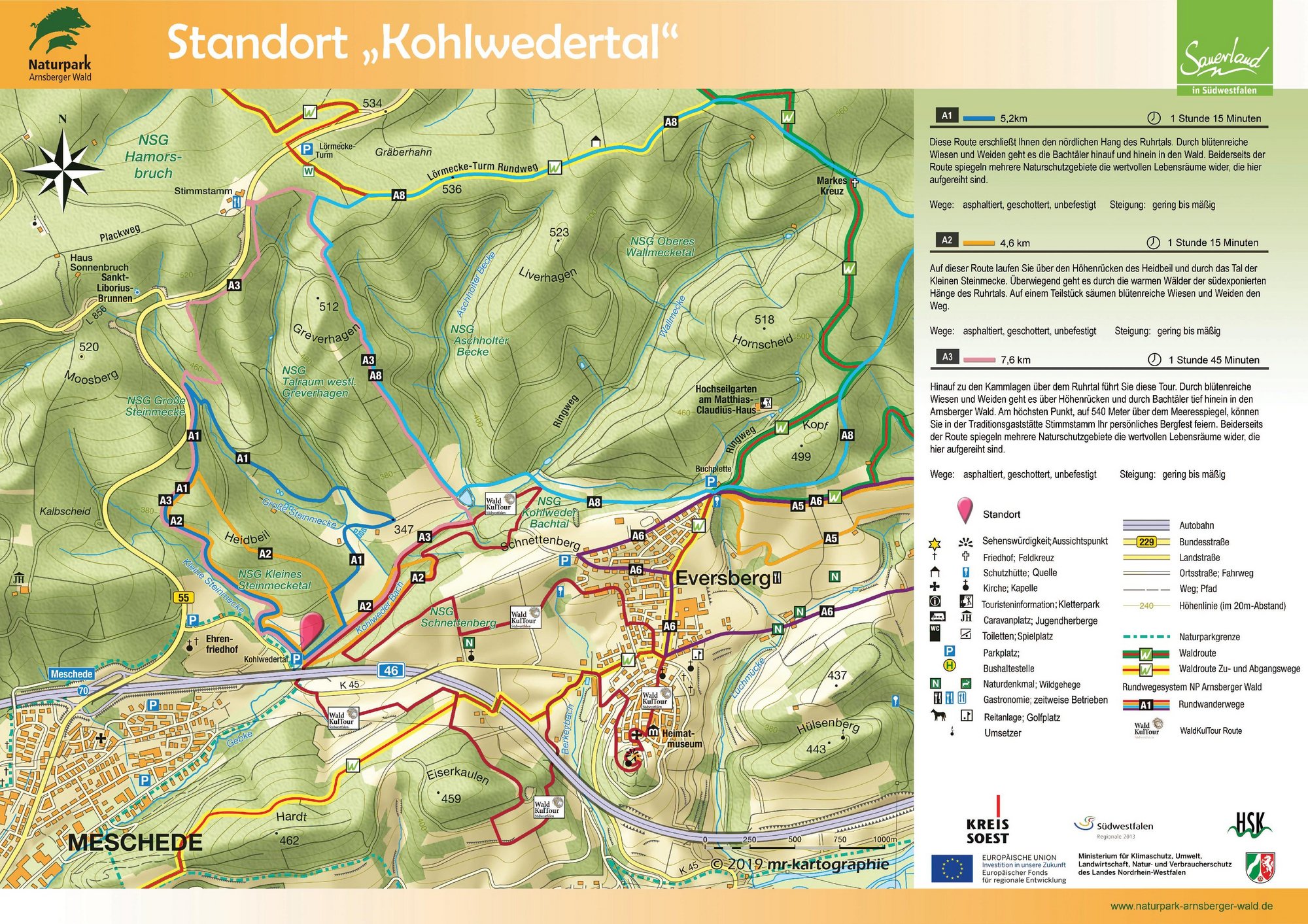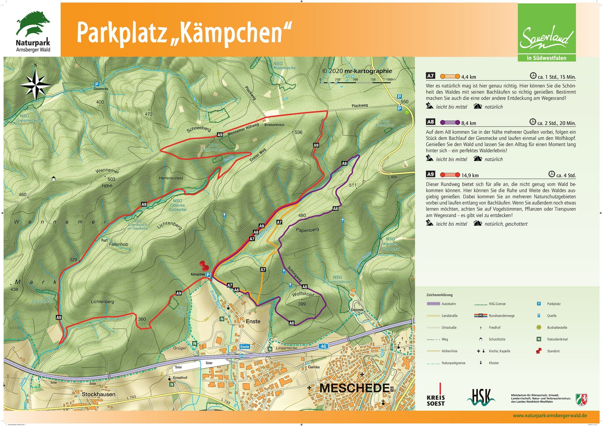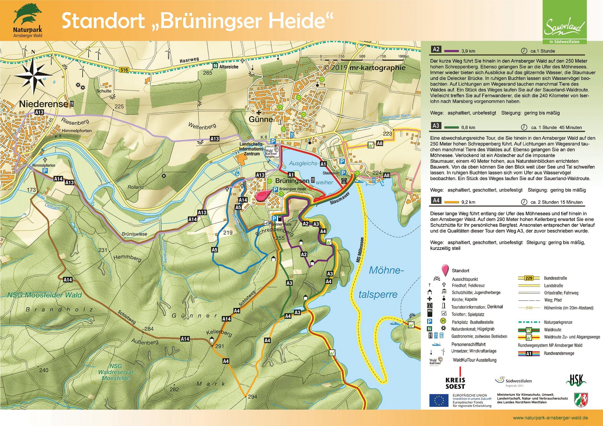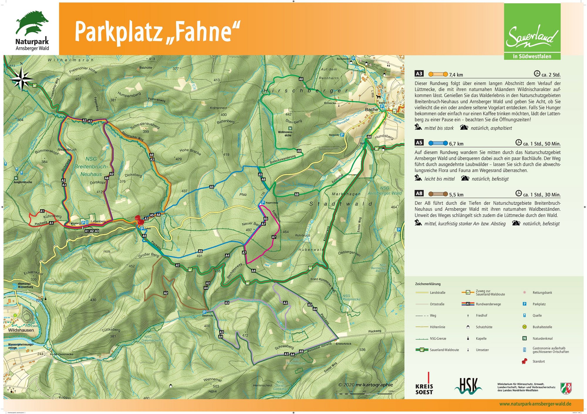 Auf den Orientierungstafeln sind zusätzlich Informationen zur Wegebeschaffenheit sowie zu den Besonderheiten und Sehenswürdigkeiten im Landschaftsraum zu finden. Dadurch entgeht Ihnen nichts am Wegesrand. Beeindruckende Landschaftsphänomene, faszinierende Bauwerke und herrliche Aussichten sollen Sie begleiten bei Ihren Streifzügen durch den Naturpark Arnsberger Wald!