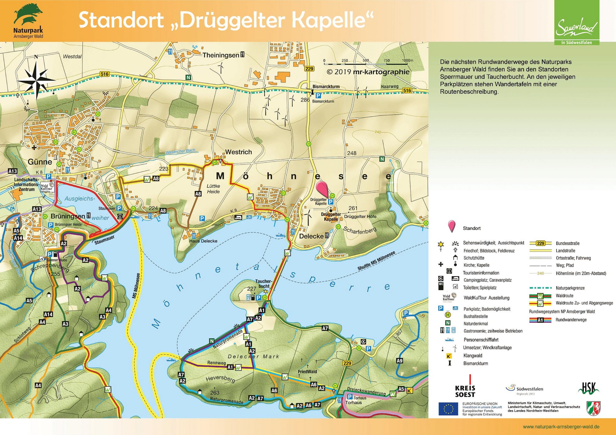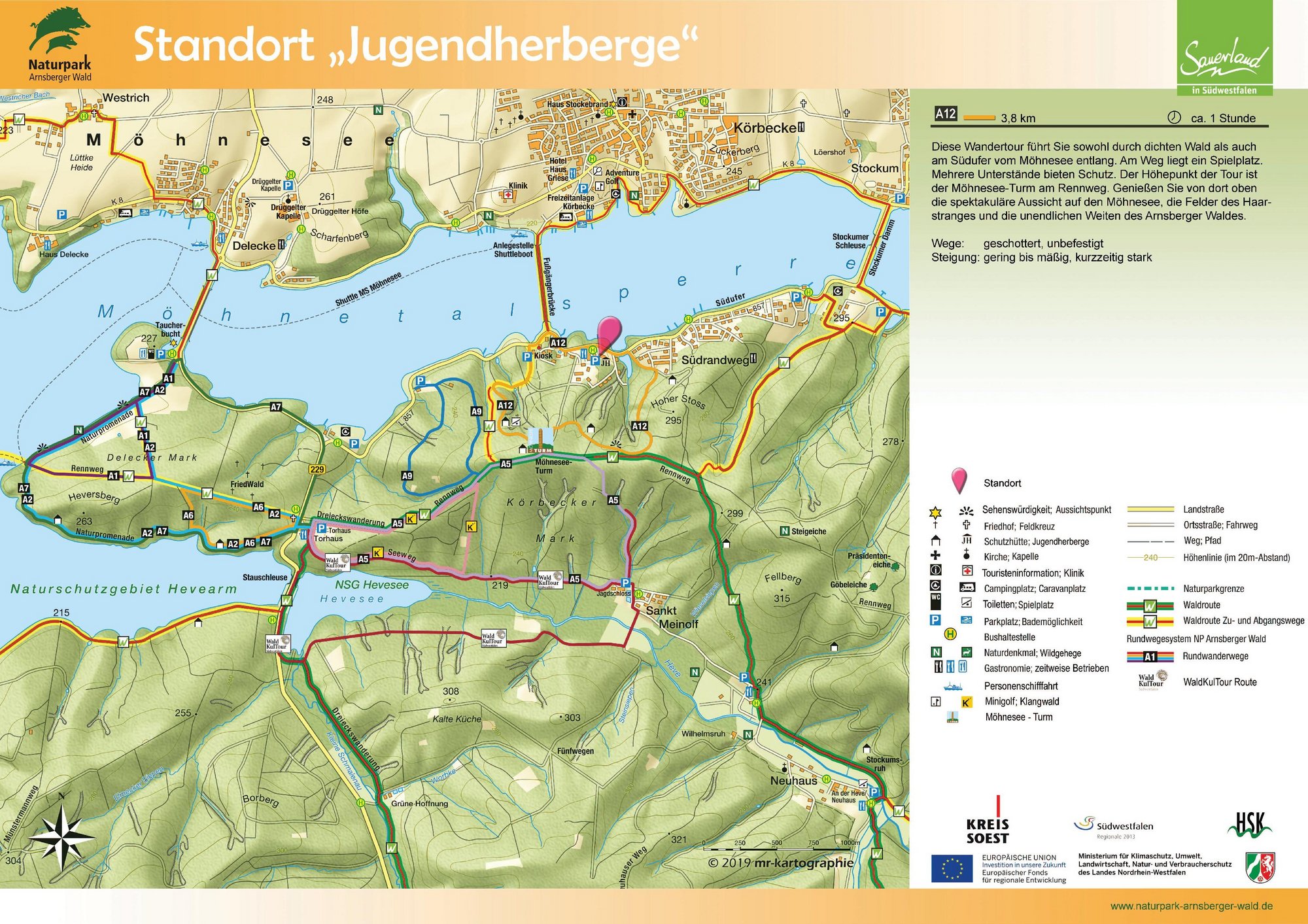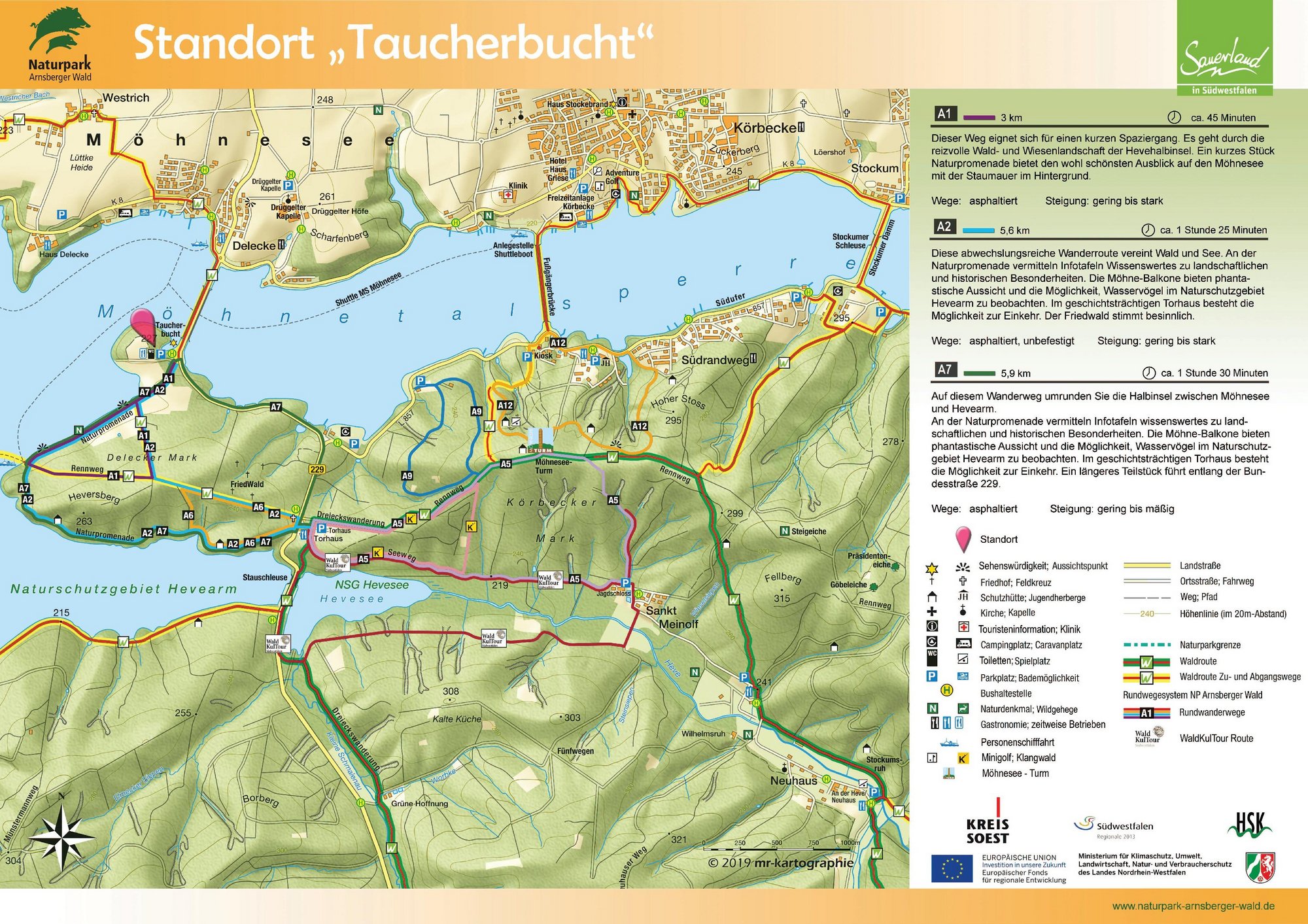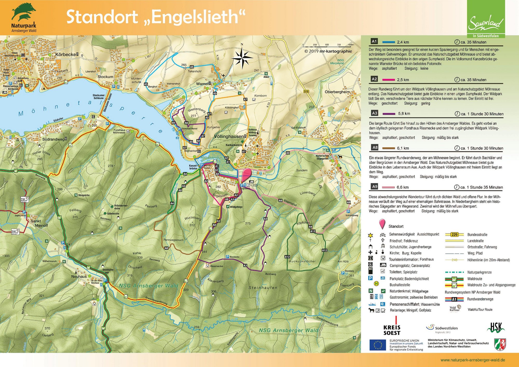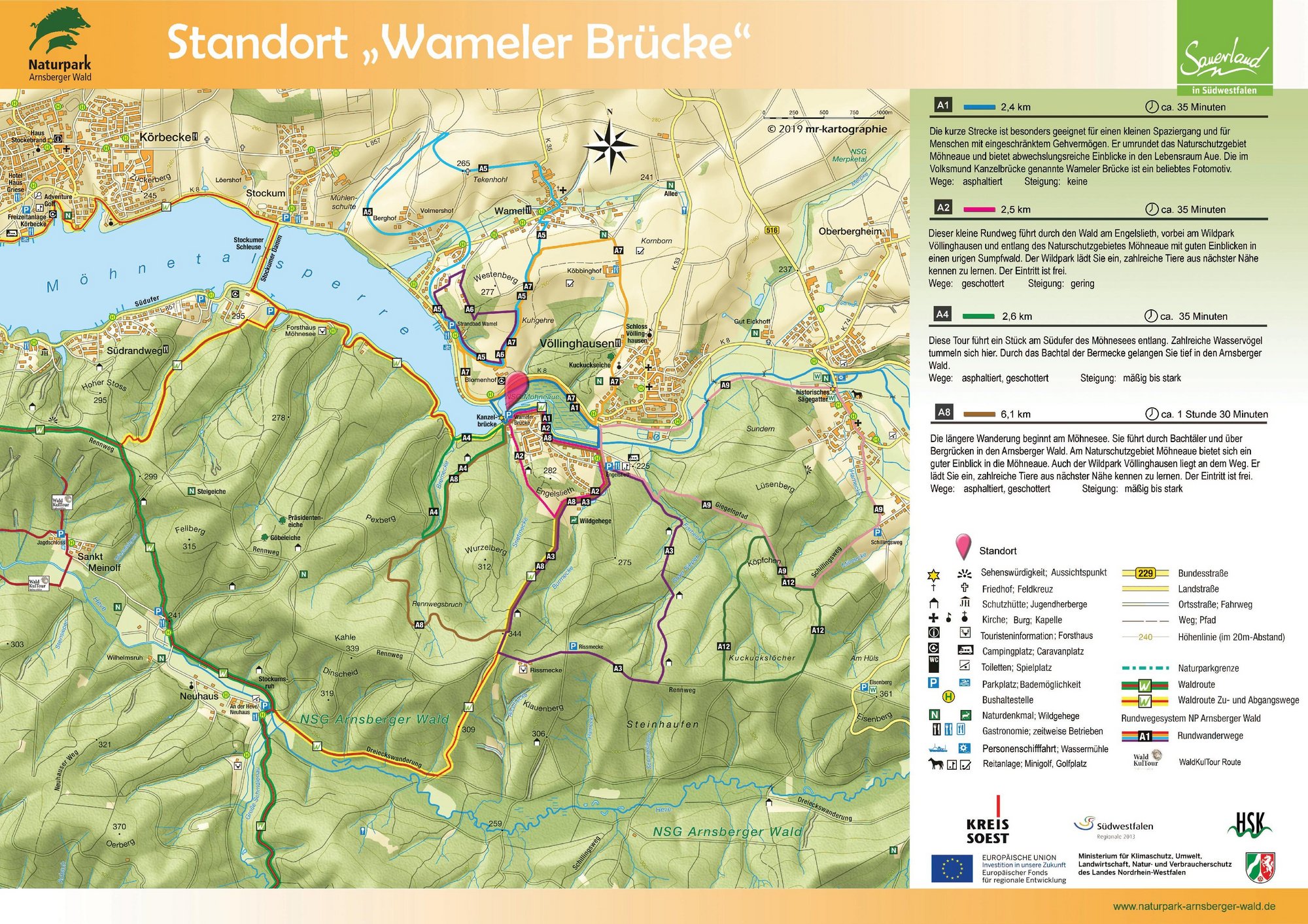 Auf den Orientierungstafeln sind zusätzlich Informationen zur Wegebeschaffenheit sowie zu den Besonderheiten und Sehenswürdigkeiten im Landschaftsraum zu finden. Dadurch entgeht Ihnen nichts am Wegesrand. Beeindruckende Landschaftsphänomene, faszinierende Bauwerke und herrliche Aussichten sollen Sie begleiten bei Ihren Streifzügen durch den Naturpark Arnsberger Wald!
