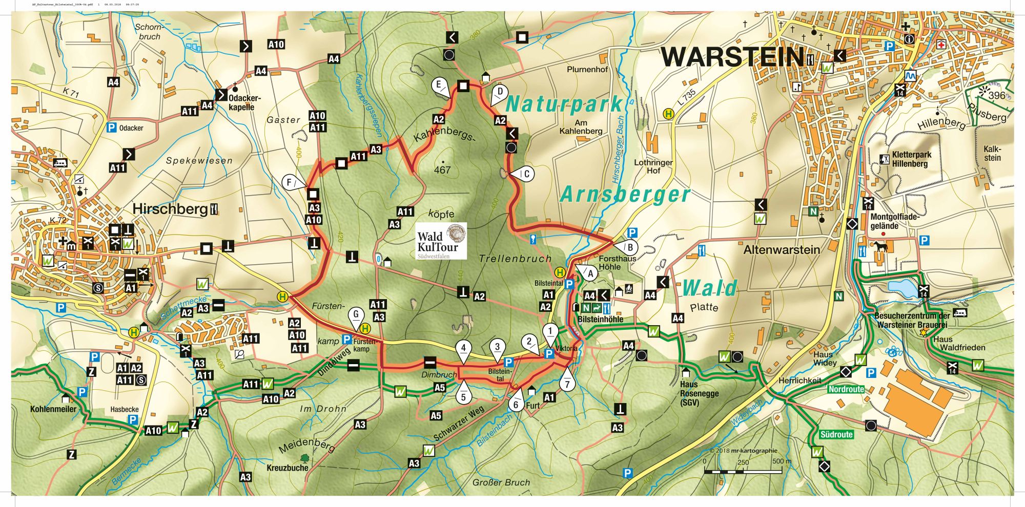 Der Wald und der Bergbau auf Metallerze standen im Raum Warstein in einer jahrhundertelangen wechselseitigen Beziehung. Auch wenn es heute nicht mehr so einfach zu erkennen ist: Der Bergbau hat die Landschaft rund um Warstein in hohem Maße geprägt - vergleichbar höchstens mit dem heute so sichtbaren Einfluss, den der Kalksteinabbau auf die Landschaft hat. Der WaldKulTour-Weg rund um den Kahlenberg in Warstein soll den Blick des interessierten Wanderers schärfen: Wo finden sich noch heute Spuren des auch in Warstein längst vergangenen Bergbaus in der Landschaft und welche konkreten Auswirkungen hatte die jahrhundertelang betriebene Montanwirtschaft auf den Wald.