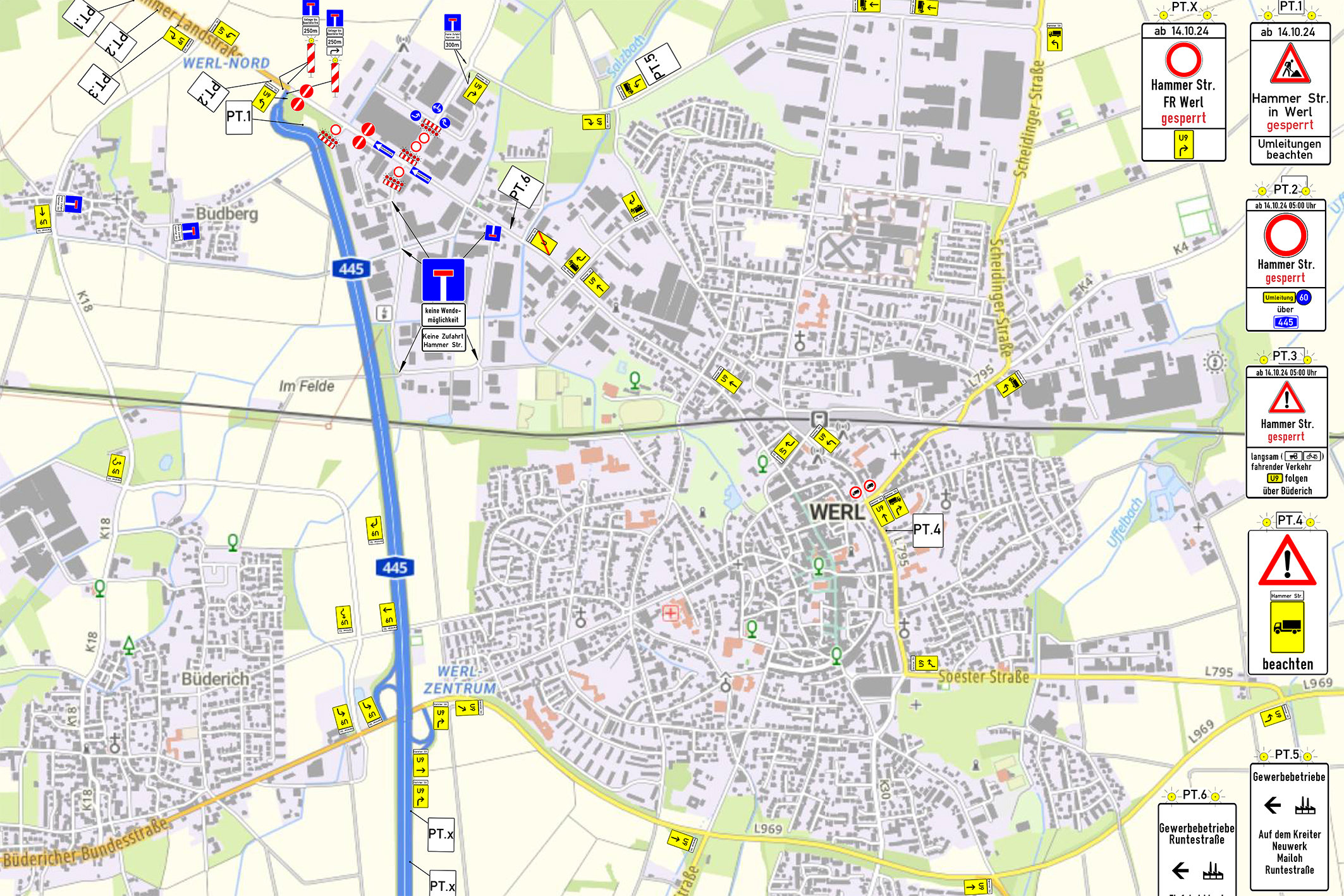Die Verkehrsanbindung der Runtestraße und der Kreisstraße Am Maifeld an die Kreuzung werden für die Bauzeit gesperrt. Die Runtestraße ist während der Bauzeit ausschließlich über die Hammer Straße erreichbar. Der Bereich der K 18 vom Knotenpunkt Hammer Landstraße bis zur Kreuzung der Stadtstraßen Am Maifeld wird über die Straßen Hansering / Auf dem Kreiter / Neuwerk umgeleitet. Sobald dieser Abschnitt saniert ist, wird der Abschnitt zwischen den Stadtstraßen Am Maifeld bis zum Hansering punktuell saniert. Dazu muss dieser Streckenabschnitt dann für einige Tage gesperrt werden. Die Umleitung führt dann über den fertiggestellten Abschnitt Hammer Landstraße / Hammer Straße.