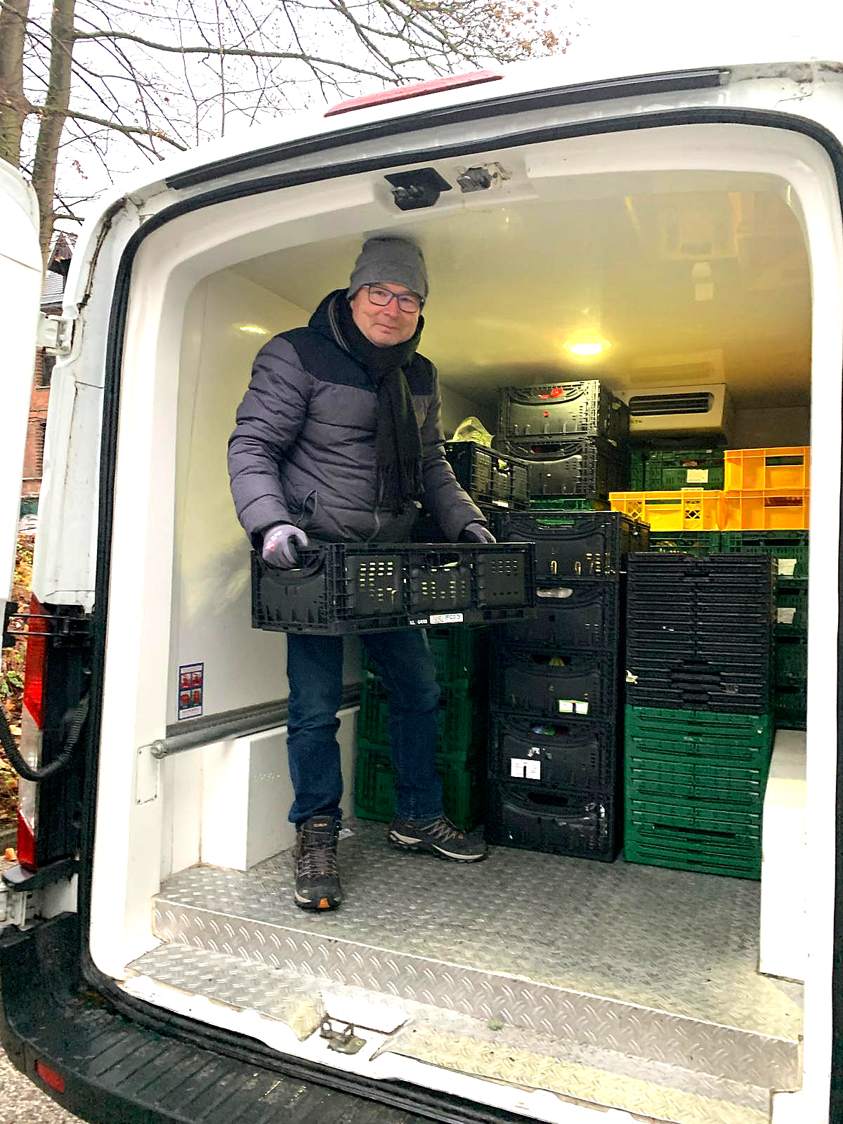 Nach einer kurzen Einführung durch Maike Oesterhaus, hauptamtliche Koordinatorin der Tafel, ging es direkt los. An den verschiedenen Stellen halfen die sieben mit. Bereits um 7.30 Uhr hatte sich ein Mitarbeiter bereit erklärt, den Bulli zu begleiten, der an den verschiedenen Punkten in der Stadt Lebensmittel und andere Spenden einsammelt. „Ich bin beeindruckt von der Logistik, die hinter der Tafel steckt“, so Thomas Schweins, Bereichsleiter für den Integrationsbereich im Jobcenter. „Die Mitarbeitenden haben die Abläufe gut im Griff und sind super vernetzt.“
