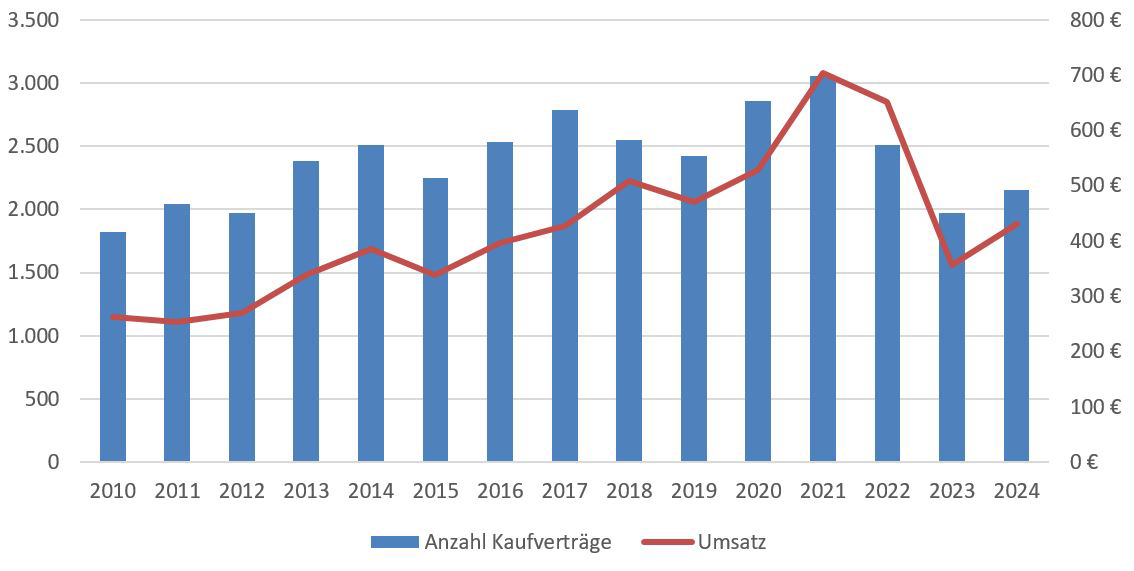 Derweil ist die Zahl der Kaufverträge deutlich nach oben geschnellt: Die 2.154 Verträge bedeuten im Vergleich zum Vorjahr ein Plus von zwölf Prozent. Schwach bleibt derweil der Neubaubereich. Im Jahr 2024 wurden lediglich 21 neue Eigentumswohnungen und 132 Bauplätze für Eigenheime veräußert. Der Durchschnitt in der vergangenen Dekade lag mit 123 neuen Eigentumswohnungen und 298 Bauplätzen pro Jahr deutlich höher.