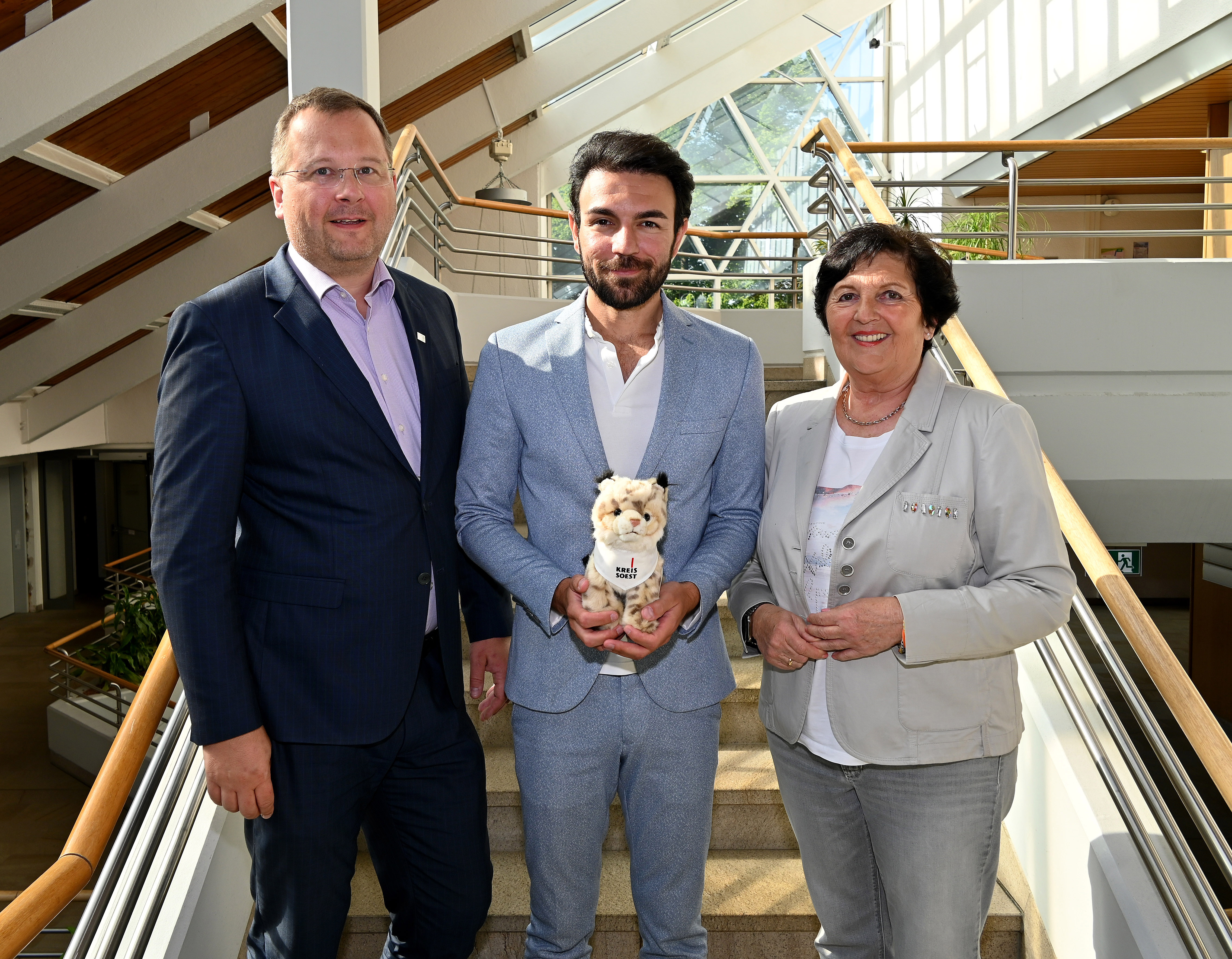 Bei seinem Antrittsbesuch im Kreishaus Soest wurde der neue LWL-Sozialdezernent Takis Mehmet Ali (Mitte) von dem Kreis-Dezernenten für Jugend, Bildung und Soziales, Sascha Kudella, und Landrätin Eva Irrgang begrüßt. Auf seinem Rückweg mit im Gepäck hatte Takis Mehmet Ali den Luchs „Leopold“ aus dem Warsteiner Bilsteintal, den ihm Eva Irrgang und Sascha Kudella als Geschenk überreicht hatten. Foto: Susanne Schulte-Nölle/ Kreis Soest