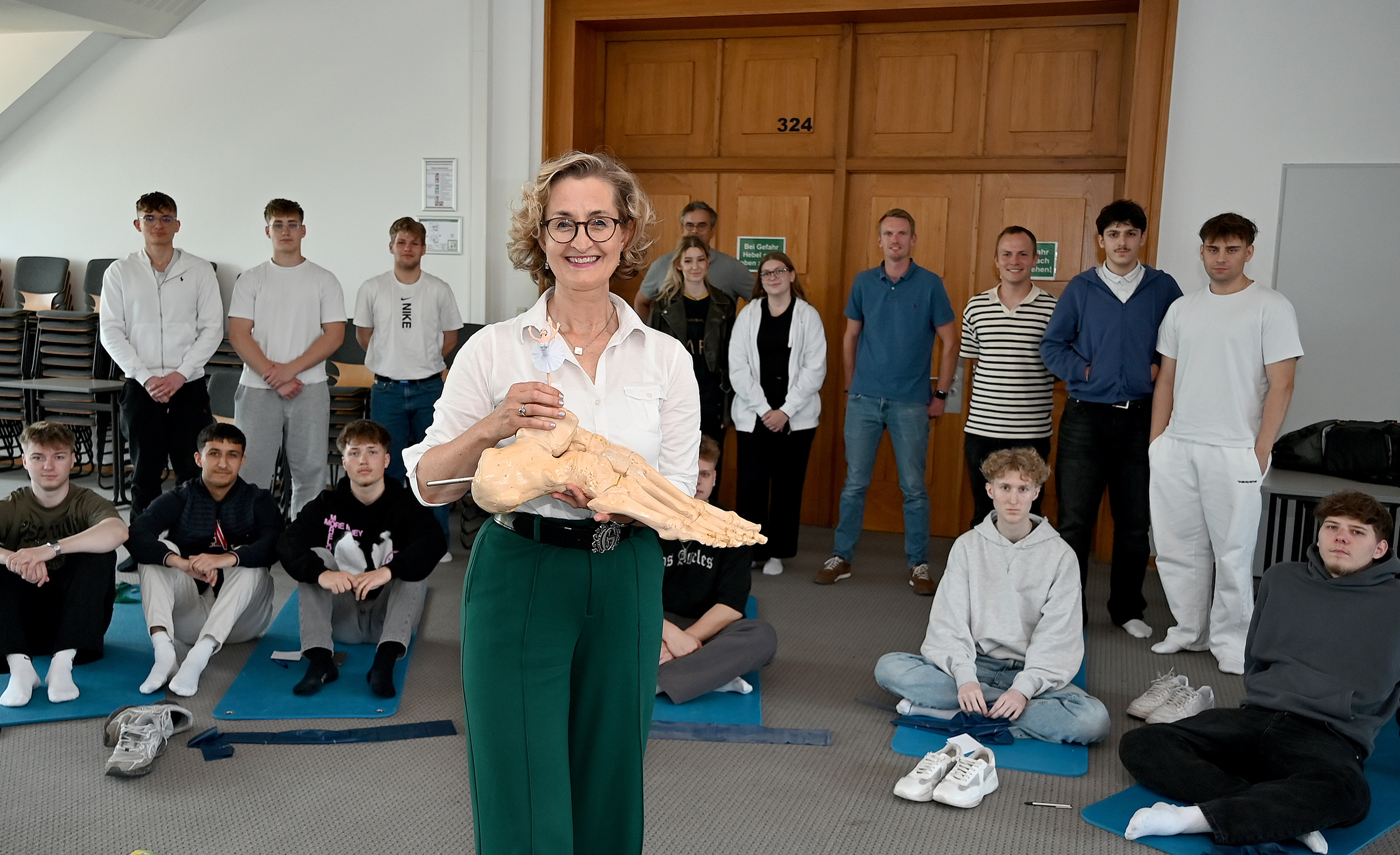 Besonders häufig kommt es vor, dass das Längsgewölbe des Fußes zu stark absinkt, so dass der Fuß in eine Hyperpronation abdriftet. „Leistungssportler macht das anfällig für schmerzhafte Entzündungen der Plantarfaszie, die an der Fußsohle zwischen Ferse und Zehen das Fußgewölbe aufspannt. Und vielen Freizeitläufern wird beispielsweise das Schienbeinkantensyndrom schmerzhaft bekannt vorkommen“, erläutert die Orthopädin Folgen, die eine Fußfehlstellung haben kann. Mit den Schülerinnen und Schülern ermittelte sie im Anschluss an einen Theorie-Teil ganz praktisch, wie das individuelle Fußgewölbe aufgebaut ist und wie der Fuß als elastischer Energiespeicher am besten unterstützt werden kann.