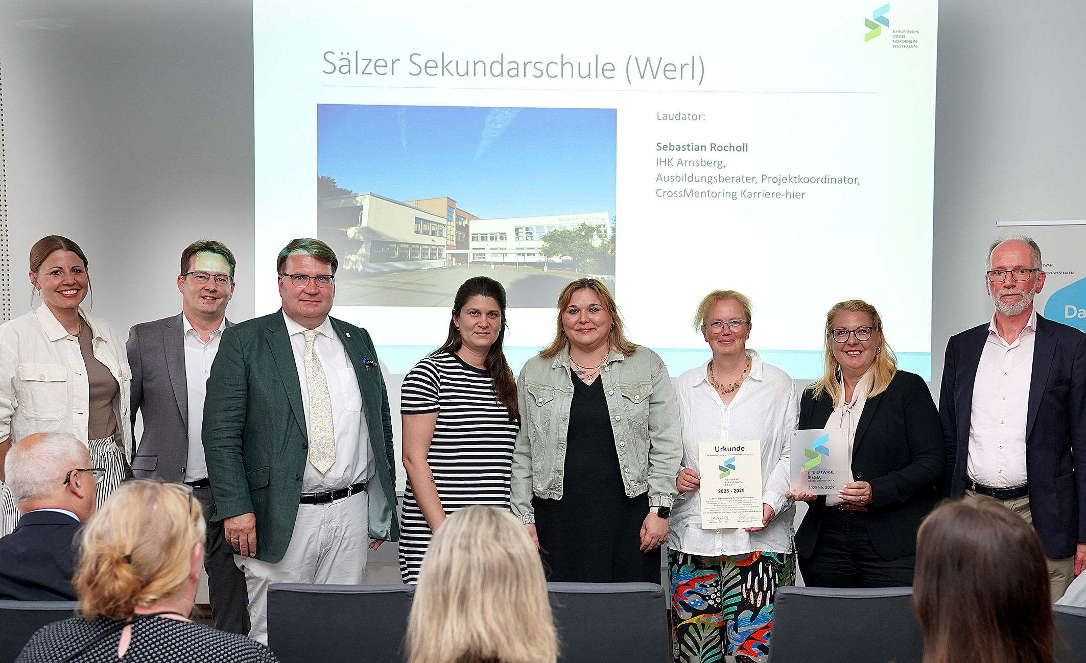 Ausgezeichnet wurden die Clarenbachschule (Soest), das Börde-Berufskolleg (Soest), die Sälzer-Sekundarschule (Werl), das Städtische Gymnasium (Erwitte), das Gymnasium Marienschule (Lippstadt) und die Gemeinschaftshauptschule am Wilzenbach (Schmallenberg). IHK-Geschäftsführer Jörg Nolte begrüßte die Gäste im Festsaal der IHK Arnsberg, Hellweg-Sauerland und stellte die Bedeutung ausgezeichneter beruflicher Orientierung an den Schulen für die wirtschaftliche Entwicklung im Kreis Soest und dem Hochsauerlandkreis heraus.