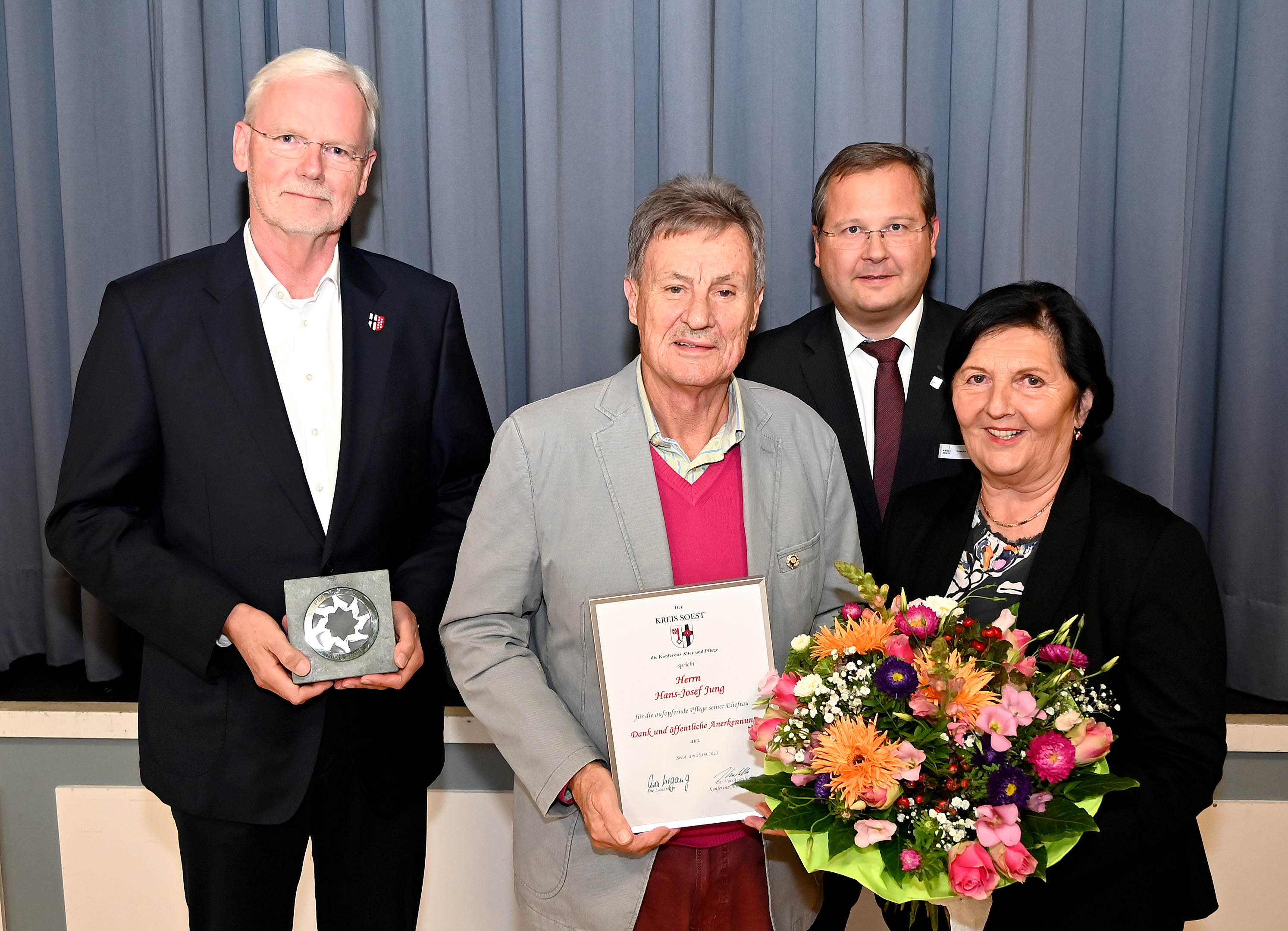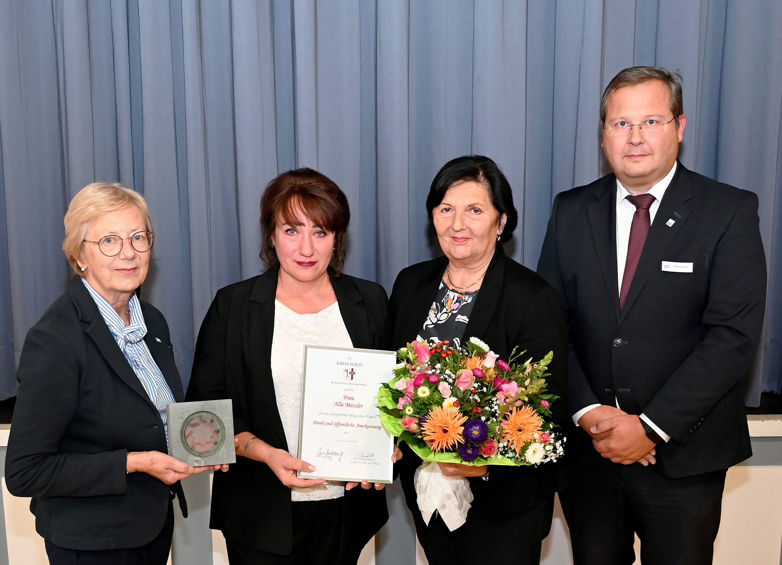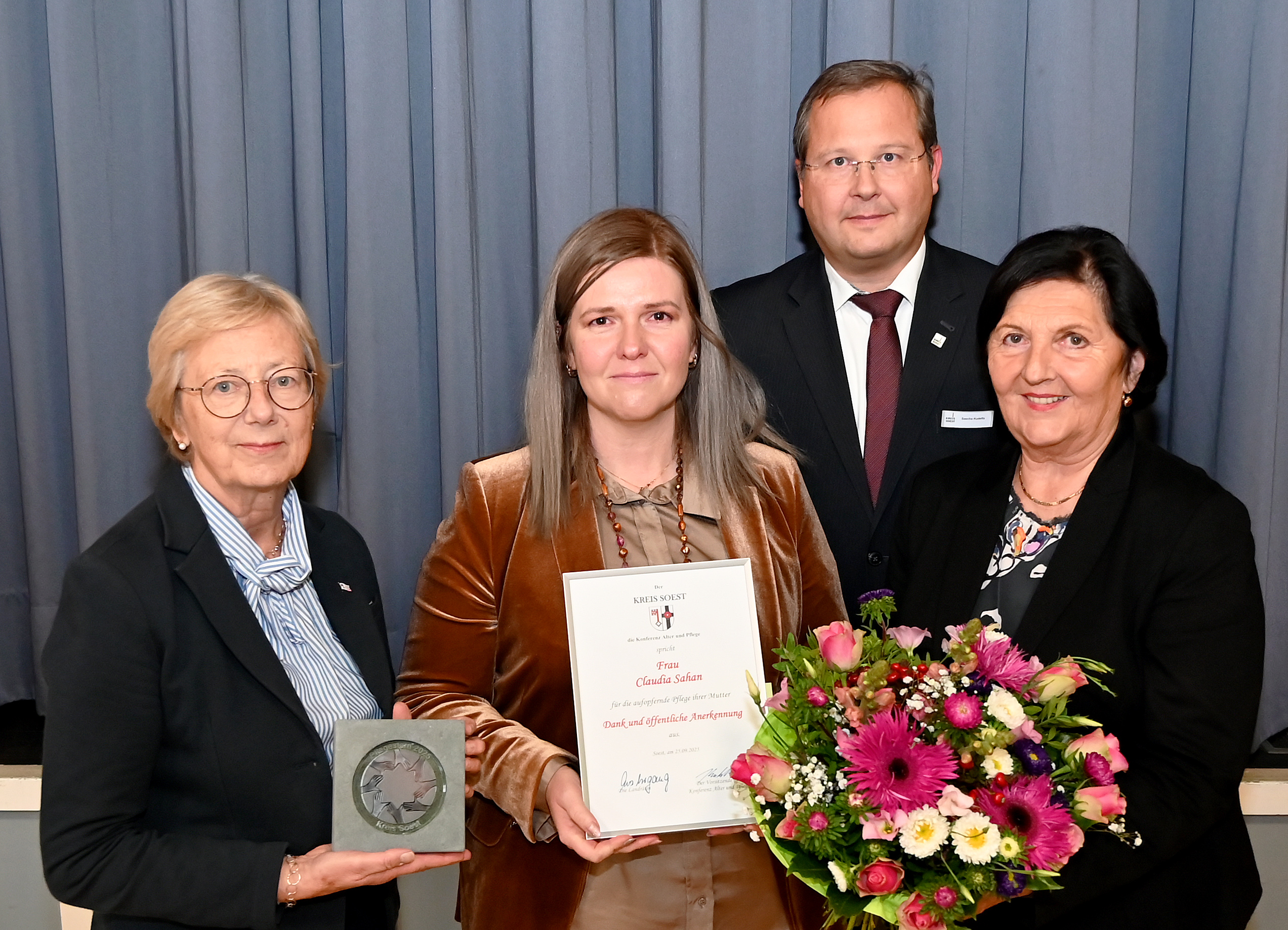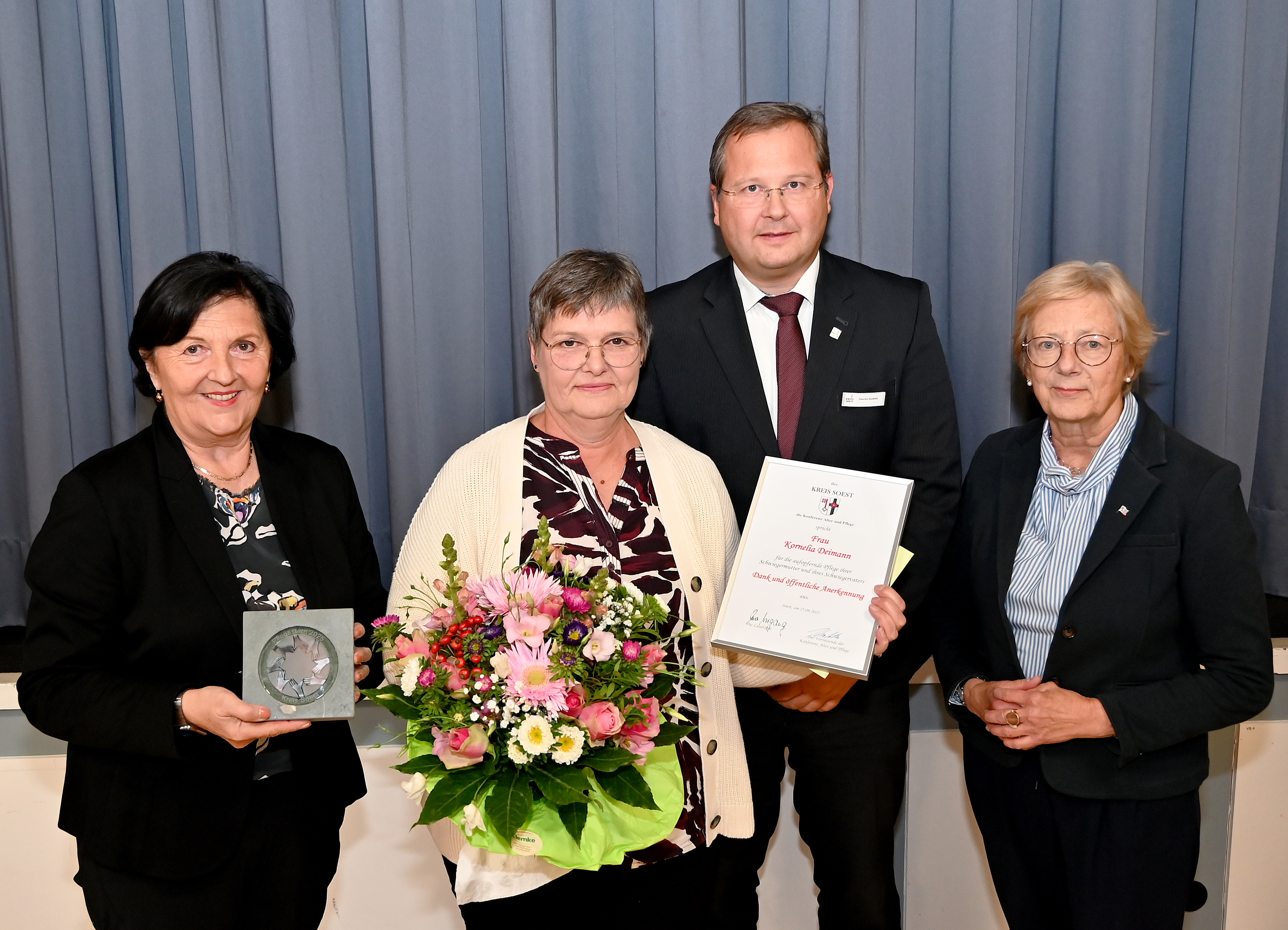 Mit dem zum 18. Mal vergebenen „Pflegestern“ geehrt wurden: Annegret Voß (Bad Sassendorf), Elke Strüwer (Ense), Dietmar Kühnel (Lippetal), Kornelia Deimann (Soest), Annelise Schumacher (Soest), Alla Metzler (Soest), Monika Saatmann (Soest), Claudia Sahan (Soest), Friedrich Gerwin (Welver) und Hans Jung (Warstein). Neben dem „Pflegestern“ erhielten die Geehrten auch eine Urkunde und einen Gutschein. Monika Saatmann konnte die Auszeichnung aus persönlichen Gründen nicht vor Ort entgegennehmen, daher hat Soests stellvertretende Bürgermeisterin Christiane Mackensen die Auszeichnung auf ihren Wunsch stellvertretend in Empfang genommen.