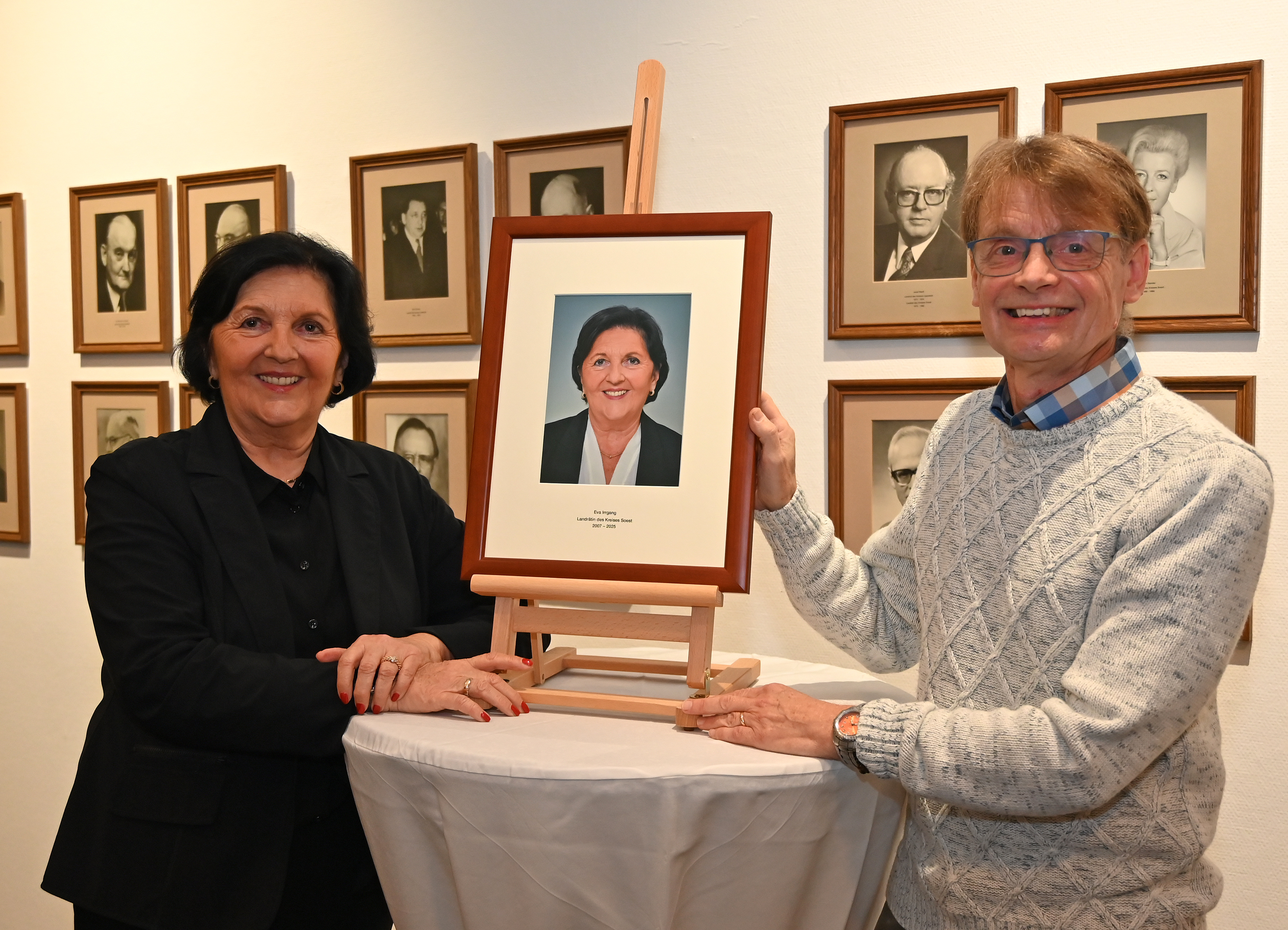 Im Anschluss an die kleine Feierstunde zur Enthüllung des Porträts wurde Eva Irrgang offiziell vom Kreistag verabschiedet. Landrat Heinrich Frieling würdigte die Verdienste seiner Vorgängerin. „Zum ersten Mal“, richtete diese anschließend das Wort an den Kreistag, „stehe ich hier nicht mehr als amtierende Landrätin, sondern als Eva Irrgang, die nach 18 Jahren im Amt auf eine spannende, ereignisreiche und erfüllende Zeit zurückblickt“.