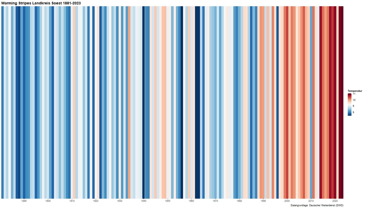 „Warming Stripes“ für den Kreis Soest – eine grafische Darstellung der jährlichen Durchschnittstemperaturen – zeigen, was alle spüren: der Klimawandel ist schon lange bei uns angekommen. Sind Sie für heiße Tag gut vorbereitet?