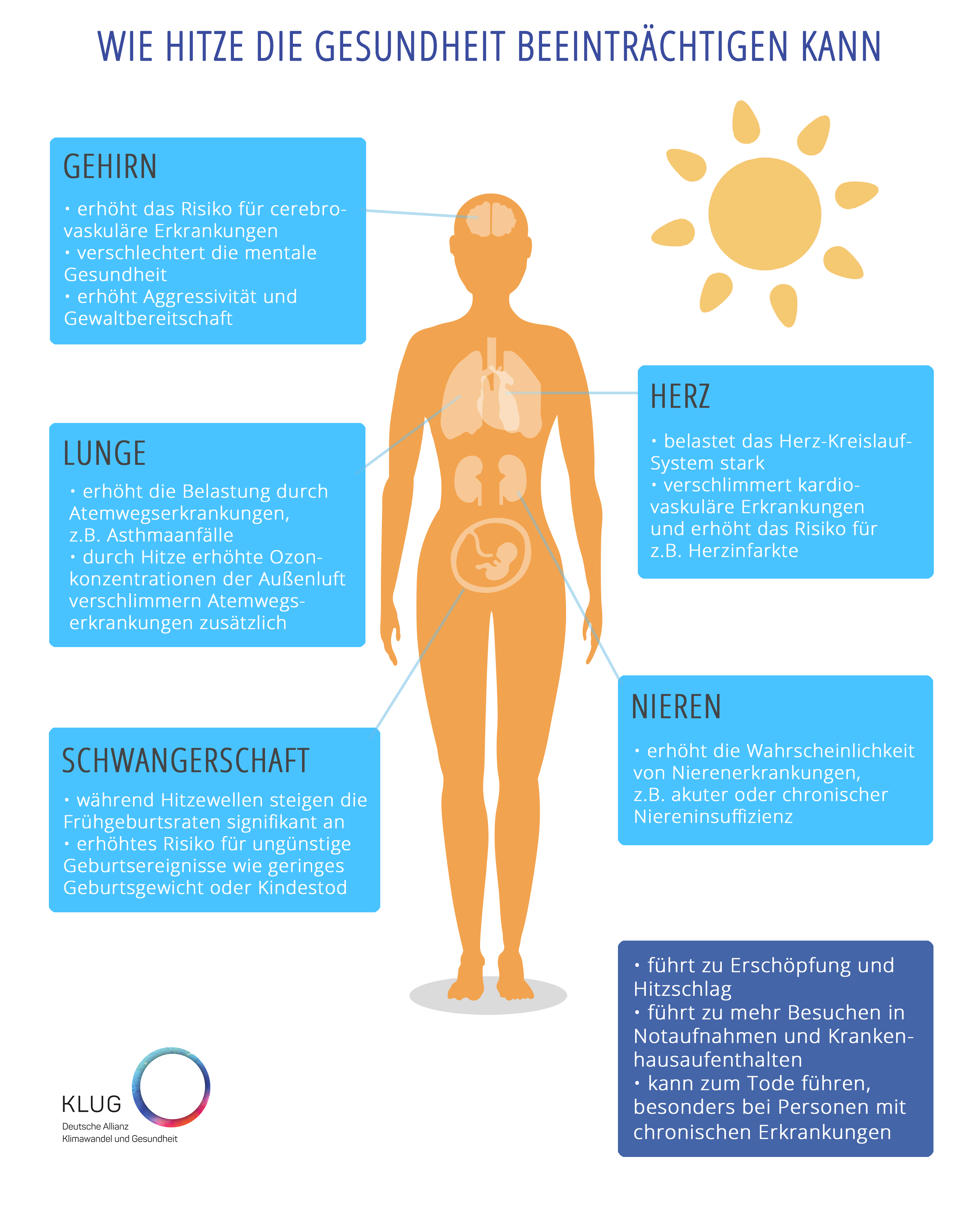 Insbesondere wenn Menschen mehrere Vorerkrankungen haben oder verschiedene Medikamente einnehmen, sollte vor einer Hitzeperiode besprochen werden, wie diese Person sich vor den Einflüssen der Hitze schützen kann. Je nach gesundheitlicher Lage kann es wichtig sein, das Verhalten während einer Hitzeperiode anzupassen, zum Beispiel durch mehr Trinken oder weniger Zeit im Freien. Es kann auch über die Anpassung des Medikationsplan gesprochen werden. Bei Fragen wenden Sie sich an Ihre Hausärztin oder Ihren Hausarzt.