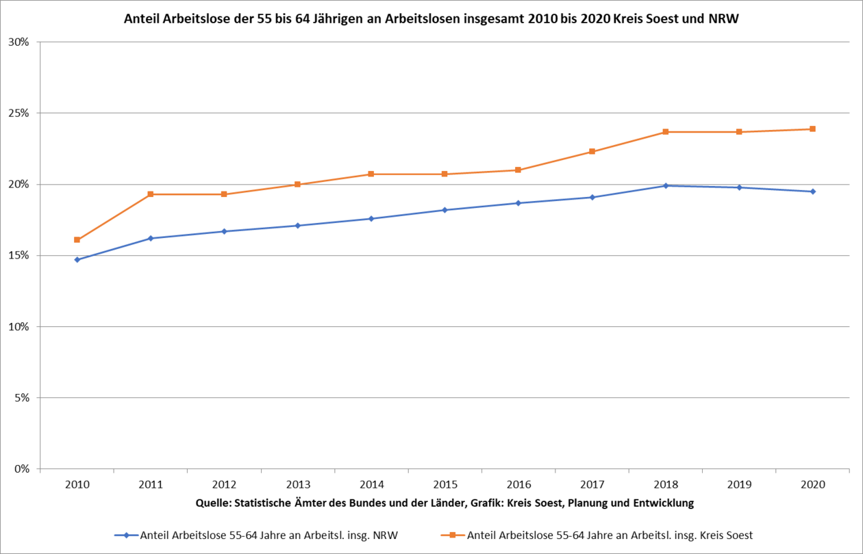 Die durchschnittliche Arbeitslosenquote der 55- bis 64-Jährigen im Kreis Soest liegt bei 21 Prozent und ist damit rund 244 Prozent höher als die durchschnittliche Arbeitslosenquote im Kreis Soest insgesamt.