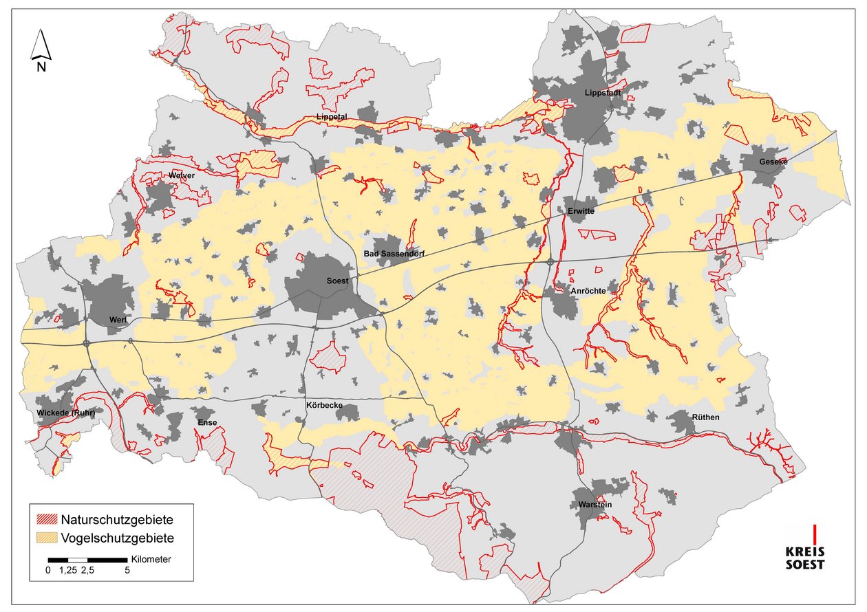 - Eine Karte zeigt die Vogelschutzgebiete im Kreis Soest. Tipp zur Karte: Vogelschutzgebiete sind gelb schraffiert, Naturschutzgebiete sind durch rote Flächen dargestellt.