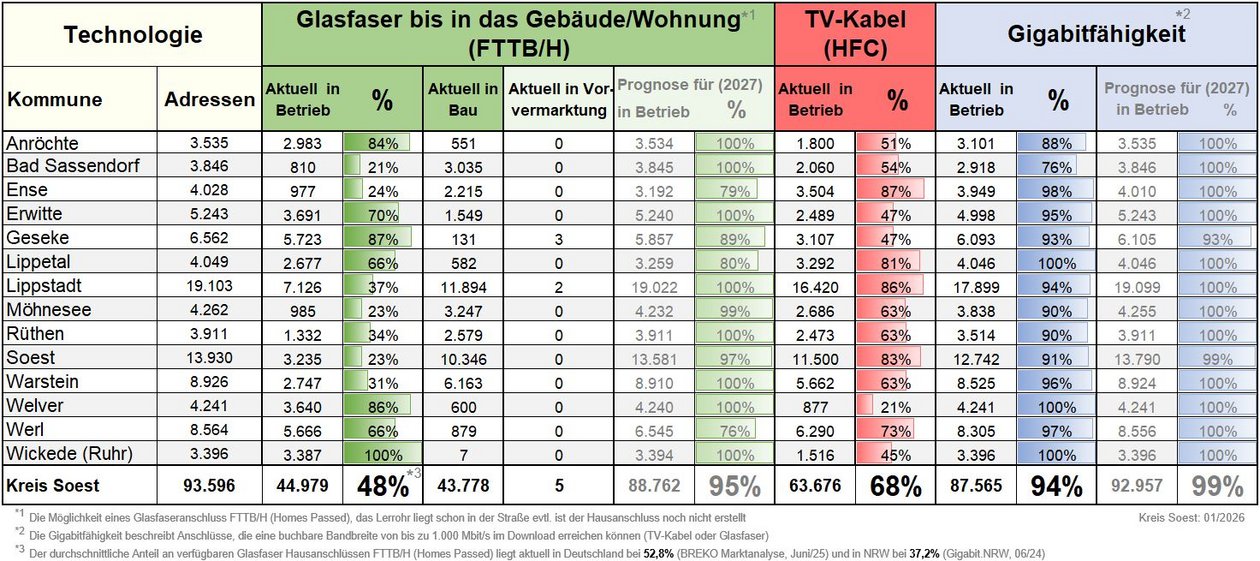 Mit den beiden Breitbandtechnologien Glasfaser bis ins Haus (FTTB, Fiber To The Building) und TV-Kabelnetz (HFC, Hybrid Fiber Coax) können Download-Geschwindigkeiten von bis zu 1.000 MBit/s erreicht werden. Diese Kapazität wird als „Gigabitfähigkeit“ bezeichnet. Von den insgesamt 93.596 Anschlüssen im Kreis Soest haben schon 48% die Möglichkeit sich mit Glasfaser zu versorgen. Die Tabelle zeigt, wie die aktuelle Versorgung im Detail aussieht.