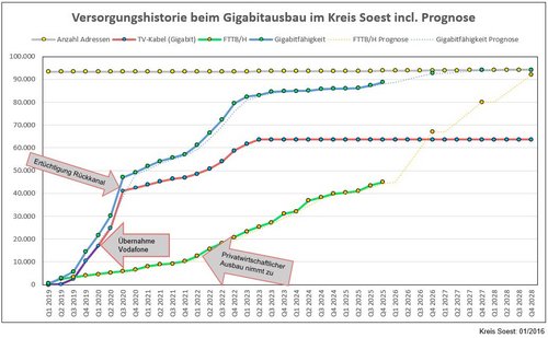 Zwölf Telekommunikationsunternehmen (TKU) bauen aktuell im Kreis Soest ihre Glasfasernetze aus und es herrscht bei den TKU eine hohe Dynamik, weiter in unsere Region zu investieren. Zusätzliche Förderung würde diese Dynamik bremsen. Unser Ziel ist es, bis 2030 für alle Haushalte im Kreis Soest ein Angebot zu schaffen auch an zukunftsfähige Glasfaser angeschlossen zu werden.