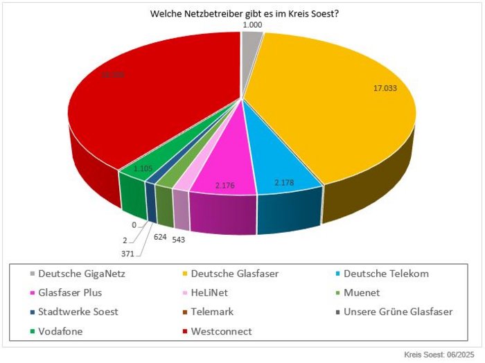 Die Breitbandversorgung ist in Deutschland eine Aufgabe der Privatwirtschaft. In welcher Kommune und in welcher Straße im Kreis Soest Haushalte und Unternehmen schnelles Internet erhalten, entscheiden Telekommunikationsunternehmen (TKU) nach den Regeln der freien Marktwirtschaft. Um den privatwirtschaftlichen Ausbau voranzutreiben, führt der Kreis Soest permanent aufwendige Gespräche mit Investoren und TKU, um weitere Gebiete im Kreisgebiet an eine zukunftsfähige Glasfaser-Internetversorgung anzubinden.