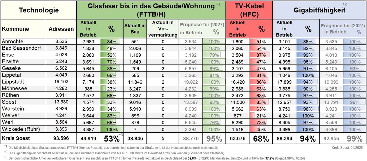 Mit den beiden Breitbandtechnologien Glasfaser bis ins Haus (FTTB, Fiber To The Building) und TV-Kabelnetz (HFC, Hybrid Fiber Coax) können Download-Geschwindigkeiten von bis zu 1.000 MBit/s erreicht werden. Diese Kapazität wird als „Gigabitfähigkeit“ bezeichnet. Von den insgesamt 93.596 Adressen im Kreis Soest haben schon 53% die Möglichkeit sich mit Glasfaser zu versorgen. Die Tabelle zeigt, wie die aktuelle Versorgung im Detail aussieht.