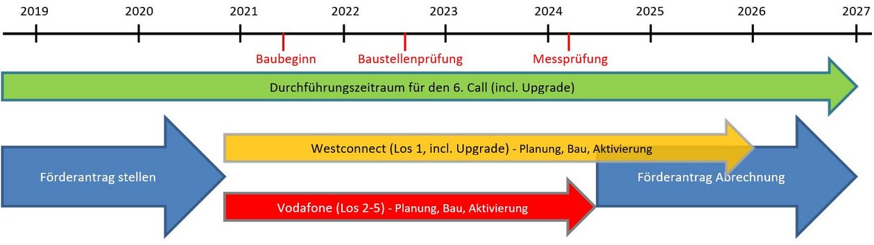 Der Kreis Soest hat im Auftrag aller Städte und Gemeinden einen Förderantrag im Rahmen der "Förderung zur Unterstützung des Breitbandausbaus in der Bundesrepublik Deutschland" gestellt, dem sogenannten 6. Call (Aufruf). Dieser wurde 2020 vom Bund und vom Land bewilligt. Ende 2022 änderten sich die Förderbedingungen, so dass weitere Adresse im laufenden Verfahren förderfähig wurden. Der Kreis Soest nutzte diese Gelegenheit und stellte für die nun zusätzlich förderfähig gewordenen Adressen im April 2023 einen Änderungsantrag, der bereits im Juli 2023 bewilligt wurde. Im Zuge des laufenden Glasfaserausbaus werden diese neuen Adressen nun mit eingeplant. Durch diese Erweiterung (oder auch Upgrade genannt) werden nun alle unwirtschaftlichen Bereiche mit einem Glasfasernetzanschluss versorgt. Die restlichen Bereiche sind für den privatwirtschafltichen Ausbau erschließbar.